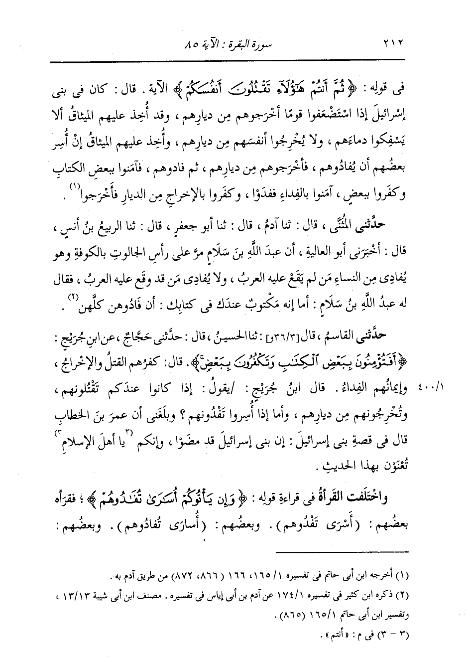 قَالَ ابْنُ جُرَيْجٍ: يَقُولُ: " §إِذَا كَانُوا عِنْدَكُمْ تَقْتُلُونَهُمْ وَتُخْرِجُونَهُمْ مِنْ دِيَارِهِمْ. وَأَمَّا إِذَا أُسِرُوا تَفْدُونَهُمْ؟ وَبَلَغَنِي أَنَّ عُمَرَ بْنَ الْخَطَّابِ قَالَ فِي قِصَّةِ بَنِي إِسْرَائِيلَ: إِنَّ بَنِي إِسْرَائِيلَ قَدْ مَضَوْا وَإِنَّكُمْ أَنْتُمْ تُعْنَوْنَ بِهَذَا الْحَدِيثِ " وَاخْتَلَفَ الْقُرَّاءُ فِي قِرَاءَةِ قَوْلِهِ: (وَإِنْ يَأْتُوكُمْ أُسَارَى تَفْدُوهُمْ) فَقَرَأَهُ بَعْضُهُمْ: أَسْرَى تَفْدُوهُمْ وَبَعْضُهُمْ: {أُسَارَى تُفَادُوهُمْ} [البقرة: 85] ، وَبَعْضُهُمْ