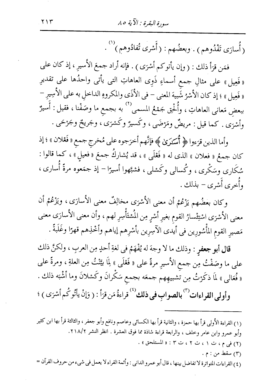 : (أُسَارَى تَفْدُوهُمْ) وَبَعْضُهُمْ: (أَسْرَى تُفَادُوهُمْ) قَالَ أَبُو جَعْفَرٍ: فَمَنْ قَرَأَ ذَلِكَ: (وَإِنْ يَأْتُوكُمْ أَسْرَى) فَإِنَّهُ أَرَادَ جَمْعَ الْأَسِيرِ، إِذْ كَانَ عَلَى فَعِيلٍ عَلَى مِثَالِ جَمْعِ أَسْمَاءِ ذَوِي الْعَاهَاتِ الَّتِي يَأْتِي وَاحِدُهَا عَلَى تَقْدِيرِ فَعِيلٍ، إِذْ كَانَ الْأَسْرُ شَبِيهَ الْمَعْنَى فِي الْأَذَى وَالْمَكْرُوهِ الدَّاخِلِ عَلَى الْأَسِيرِ بِبَعْضِ مَعَانِي الْعَاهَاتِ؛ وَأَلْحَقَ جَمْعَ الْمُسْتَلْحَقِ بِهِ بِجَمْعِ مَا وَصَفْنَا، فَقِيلَ أَسِيرٌ وَأَسْرَى، كَمَا قِيلَ مَرِيضٌ وَمَرْضَى وَكَسِيرٌ وَكَسْرَى، وَجَرِيحٌ وَجَرْحَى. قَالَ أَبُوجَعْفَرٍ: وَأَمَّا الَّذِينَ قَرَءُوا ذَلِكَ: {أُسَارَى} [البقرة: 85] ، فَإِنَّهُمْ أَخْرَجُوهُ عَلَى مَخْرَجِ جَمْعِ فَعْلَانَ، إِذْ كَانَ جَمْعُ فَعْلَانَ الَّذِي لَهُ فَعْلَى قَدْ يُشَارِكُ جَمْعَ فَعِيلٍ، كَمَا قَالُوا سُكَارَى وَسَكْرَى وَكَسَالَى وَكَسْلَى، فَشَبَّهُوا أَسِيرًا وَجَمَعُوهُ مَرَّةً أُسَارَى وَأُخْرَى أَسْرَى بِذَلِكَ. وَكَانَ بَعْضُهُمْ يَزْعُمُ أَنَّ مَعْنَى الْأَسْرَى مُخَالِفٌ مَعْنَى الْأُسَارَى، وَيَزْعُمُ أَنَّ مَعْنَى الْأَسْرَى اسْتِئْسَارُ الْقَوْمِ بِغَيْرِ أَسْرٍ مِنَ الْمُسْتَأْسَرِ لَهُمْ، وَأَنَّ مَعْنَى الْأُسَارَى مَعْنَى مَصِيرِ الْقَوْمِ الْمَأْسُورِينَ فِي أَيْدِي الْآسِرِينَ بِأَسْرِهِمْ وَأَخْذِهِمْ قَهْرًا وَغَلَبَةً. قَالَ أَبُو جَعْفَرٍ: وَذَلِكَ مَا لَا وَجْهَ لَهُ يُفْهَمُ فِي لُغَةِ أَحَدٍ مِنَ الْعَرَبِ، وَلَكِنَّ ذَلِكَ عَلَى مَا وَصَفْتُ مِنْ جَمْعِ الْأَسِيرِ مَرَّةً عَلَى فَعْلَى لِمَا بَيَّنْتُ مِنَ الْعِلَّةِ، وَمَرَّةً عَلَى فُعَالَى لِمَا ذَكَرْتُ مِنْ تَشْبِيهِهِمْ جَمْعَهُ بِجَمْعِ سَكْرَانَ وَكَسْلَانَ وَمَا أَشْبَهَ ذَلِكَ. وَأَوْلَى بِالصَّوَابِ فِي ذَلِكَ قِرَاءَةُ مَنْ قَرَأَ: (وَإِنْ يَأْتُوكُمْ أَسْرَى)