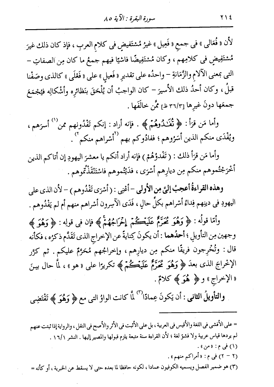 لِأَنَّ فُعَالَى فِي جَمْعِ فَعِيلٍ غَيْرُ مُسْتَفِيضٍ فِي كَلَامِ الْعَرَبِ. فَإِذَا كَانَ ذَلِكَ غَيْرَ مُسْتَفِيضٍ فِي كَلَامِهِمْ، وَكَانَ مُسْتَفِيضًا فَاشِيًا فِيهِمْ جَمْعُ مَا كَانَ مِنَ الصِّفَاتِ الَّتِي بِمَعْنَى الْآلَامِ وَالزَّمَانَةِ وَاحِدَةً عَلَى تَقْدِيرِ فَعِيلٍ عَلَى فُعْلَى كَالَّذِي وَصَفْنَا قَبْلُ، وَكَانَ أَحَدُ ذَلِكَ الْأَسِيرَ؛ كَانَ الْوَاجِبُ أَنْ يُلْحَقَ بِنَظَائِرِهِ وَأَشْكَالِهِ فَيُجْمَعُ جَمْعُهَا دُونَ غَيْرِهَا مِمَّنْ خَالَفَهَا. وَأَمَّا مَنْ قَرَأَ: {تُفَادُوهُمْ} [البقرة: 85] فَإِنَّهُ أَرَادَ أَنَّكُمْ تَفْدُونَهُمْ مِنْ أَسْرِهِمْ، وَيُفْدَى مِنْكُمْ، الَّذِينَ أَسَرُوهُمْ فَفَادُوكُمْ بِهِمْ، أَسْرَاكُمْ مِنْهُمْ. وَأَمَّا مِنْ قَرَأَ ذَلِكَ: (تَفْدُوهُمْ) فَإِنَّهُ أَرَادَ أَنَّكُمْ يَا مَعْشَرَ الْيَهُودِ إِنْ أَتَاكُمُ الَّذِينَ أَخْرَجْتُمُوهُمْ مِنْكُمْ مِنْ دِيَارِهِمْ أَسْرَى فَدَيْتُمُوهُمْ فَاسْتَنْقَذْتُمُوهُمْ. وَهَذِهِ الْقِرَاءَةُ أَعْجَبُ إِلَيَّ مِنَ الْأُولَى، أَعْنِي: (أَسْرَى تَفْدُوهُمْ) لِأَنَّ الَّذِي عَلَى الْيَهُودِ فِي دِينِهِمْ فِدَاءُ أَسْرَاهُمْ بِكُلِّ حَالٍ فَدَى الْآسِرُونَ أَسْرَاهُمْ مِنْهُمْ أَمْ لَمْ يُفْدُوهُمْ