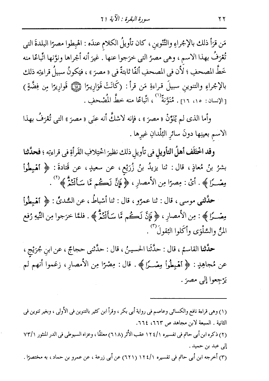 مَنْ قَرَأَ ذَلِكَ بِالْإِجْرَاءِ وَالتَّنْوِينِ، كَانَ تَأْوِيلُ الْكَلَامِ عِنْدَهُ: اهْبِطُوا مِصْرًا الْبَلْدَةَ الَّتِي تُعْرَفُ بِهَذَا الِاسْمِ وَهِيَ مِصْرُ الَّتِي خَرَجُوا عَنْهَا، غَيْرَ أَنَّهُ أَجْرَاهَا وَنَوَّنَهَا اتِّبَاعًا مِنْهُ خَطَّ الْمُصْحَفِ، لِأَنَّ فِي الْمُصْحَفِ أَلِفًا ثَابِتَةً فِي مِصْرَ، فَيَكُونُ سَبِيلُ قِرَاءَتِهِ ذَلِكَ بِالْإِجْرَاءِ وَالتَّنْوِينِ سَبِيلَ مَنْ قَرَأَ: (قَوَارِيرًا قَوَارِيرًا مِنْ فِضَّةِ) مُنَوَّنَةً اتِّبَاعًا مِنْهُ خَطَّ الْمُصْحَفِ. وَأَمَّا الَّذِي لَمْ يُنَوِّنْ مِصْرَ فَإِنَّهُ لَا شَكَّ أَنَّهُ عَنَى مِصْرَ الَّتِي تُعْرَفُ بِهَذَا الِاسْمِ بِعَيْنِهَا دُونَ سَائِرِ الْبُلْدَانِ غَيْرِهَا. وَقَدْ اخْتَلَفَ أَهْلُ التَّأْوِيلِ فِي ذَلِكَ نَظِيرَ اخْتِلَافِ الْقُرَّاءِ فِي قِرَاءَتِهِ