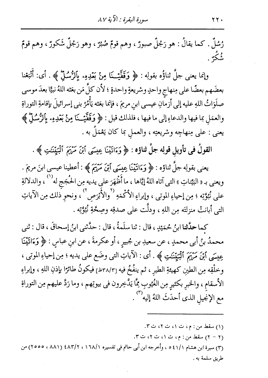 §الْقَوْلُ فِي تَأْوِيلِ قَوْلِهِ تَعَالَى: {وَآتَيْنَا عِيسَى ابْنَ مَرْيَمَ الْبَيِّنَاتِ} [البقرة: 87] يَعْنِي بِقَوْلِهِ: {وَآتَيْنَا عِيسَى ابْنَ مَرْيَمَ الْبَيِّنَاتِ} [البقرة: 87] أَعْطَيْنَا عِيسَى ابْنَ مَرْيَمَ. وَيَعْنِي بِالْبَيِّنَاتِ الَّتِي آتَاهُ اللَّهُ إِيَّاهَا مَا أَظْهَرَ عَلَى يَدَيْهِ مِنَ الْحُجَجِ وَالدَّلَالَةِ عَلَى نُبُوَّتِهِ مِنْ إِحْيَاءِ الْمَوْتَى وَإِبْرَاءِ الْأَكْمَهِ وَنَحْوِ ذَلِكَ مِنَ الْآيَاتِ الَّتِي أَبَانَتْ مَنْزِلَتَهُ مِنَ اللَّهِ، وَدَلَّتْ عَلَى صِدْقِهِ وَصِحَّةِ نُبُوَّتِهِ