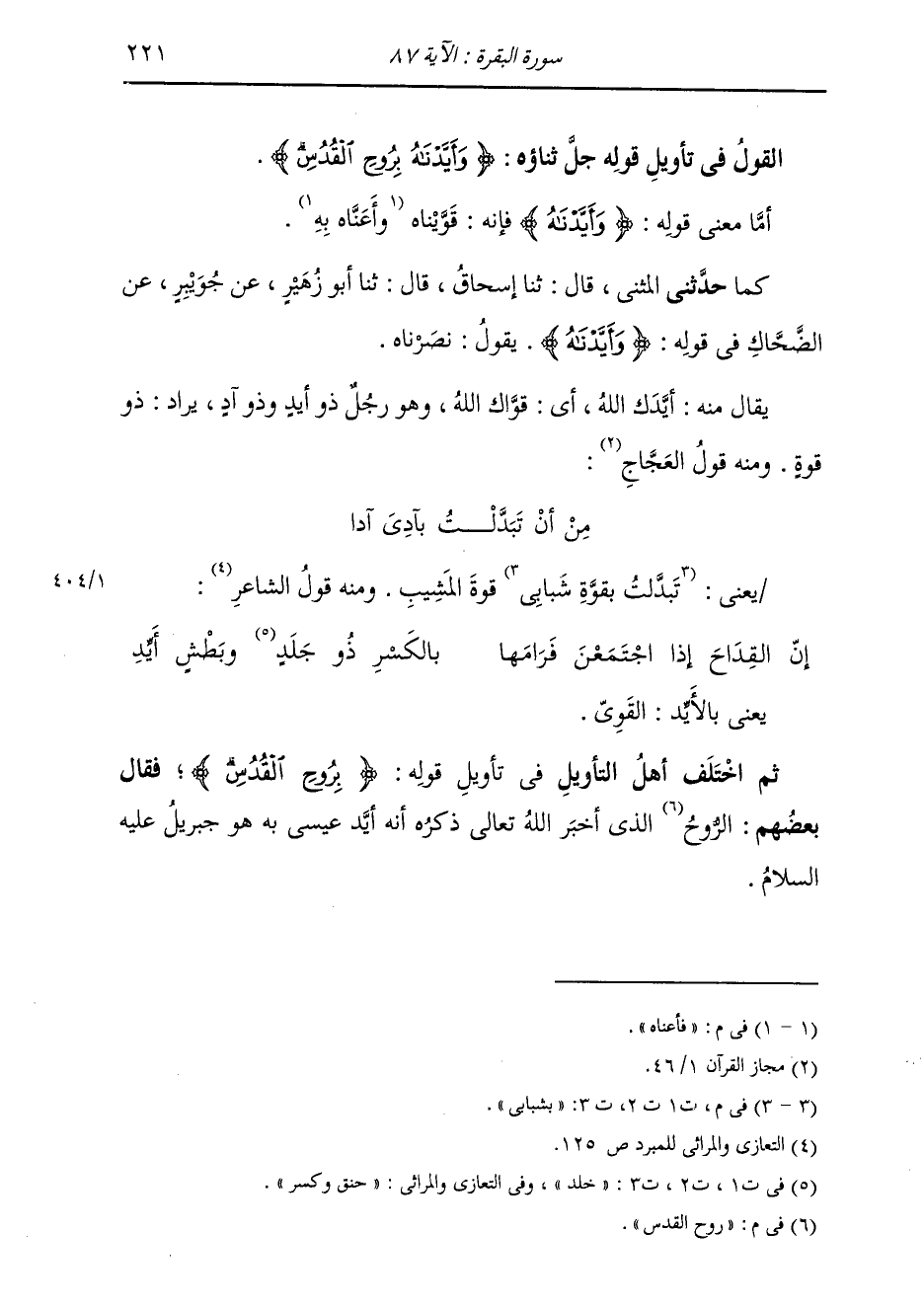 §الْقَوْلُ فِي تَأْوِيلِ قَوْلِهِ تَعَالَى: {وَأَيَّدْنَاهُ بِرُوحِ الْقُدُسِ} [البقرة: 87] أَمَا مَعْنَى قَوْلِهِ: {وَأَيَّدْنَاهُ} [البقرة: 87] فَإِنَّهُ قَوَّيْنَاهُ فَأَعَنَّاهُ