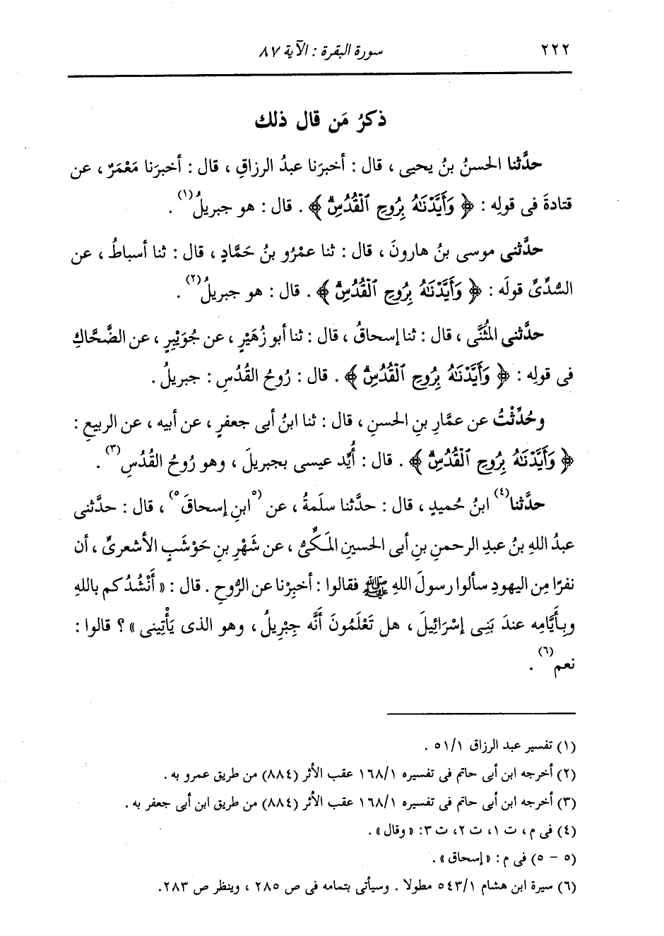 وَقَالَ ابْنُ حُمَيْدٍ: حَدَّثَنَا سَلَمَةُ، عَنْ إِسْحَاقَ، قَالَ: حَدَّثَنِي عَبْدُ اللَّهِ بْنُ عَبْدِ الرَّحْمَنِ بْنِ أَبِي الْحُسَيْنِ الْمَكِّيُّ، عَنْ شَهْرِ بْنِ حَوْشَبٍ الْأَشْعَرِيِّ: " أَنَّ نَفَرًا، مِنَ الْيَهُودِ سَأَلُوا رَسُولَ اللَّهِ صَلَّى اللهُ عَلَيْهِ وَسَلَّمَ فَقَالُوا: أَخْبِرْنَا عَنِ الرُّوحِ. قَالَ: «§أَنْشُدُكُمْ بِاللَّهِ وَبِأَيَّامِهِ عِنْدَ بَنِي إِسْرَائِيلَ هَلْ تَعْلَمُونَ أَنَّهُ جِبْرِيلُ، وَهُوَ يَأْتِينِي؟» قَالُوا: نَعَمْ " -[223]- وَقَالَ آخَرُونَ: الرُّوحُ الَّذِي أَيَّدَ اللَّهُ بِهِ عِيسَى هُوَ الْإِنْجِيلُ