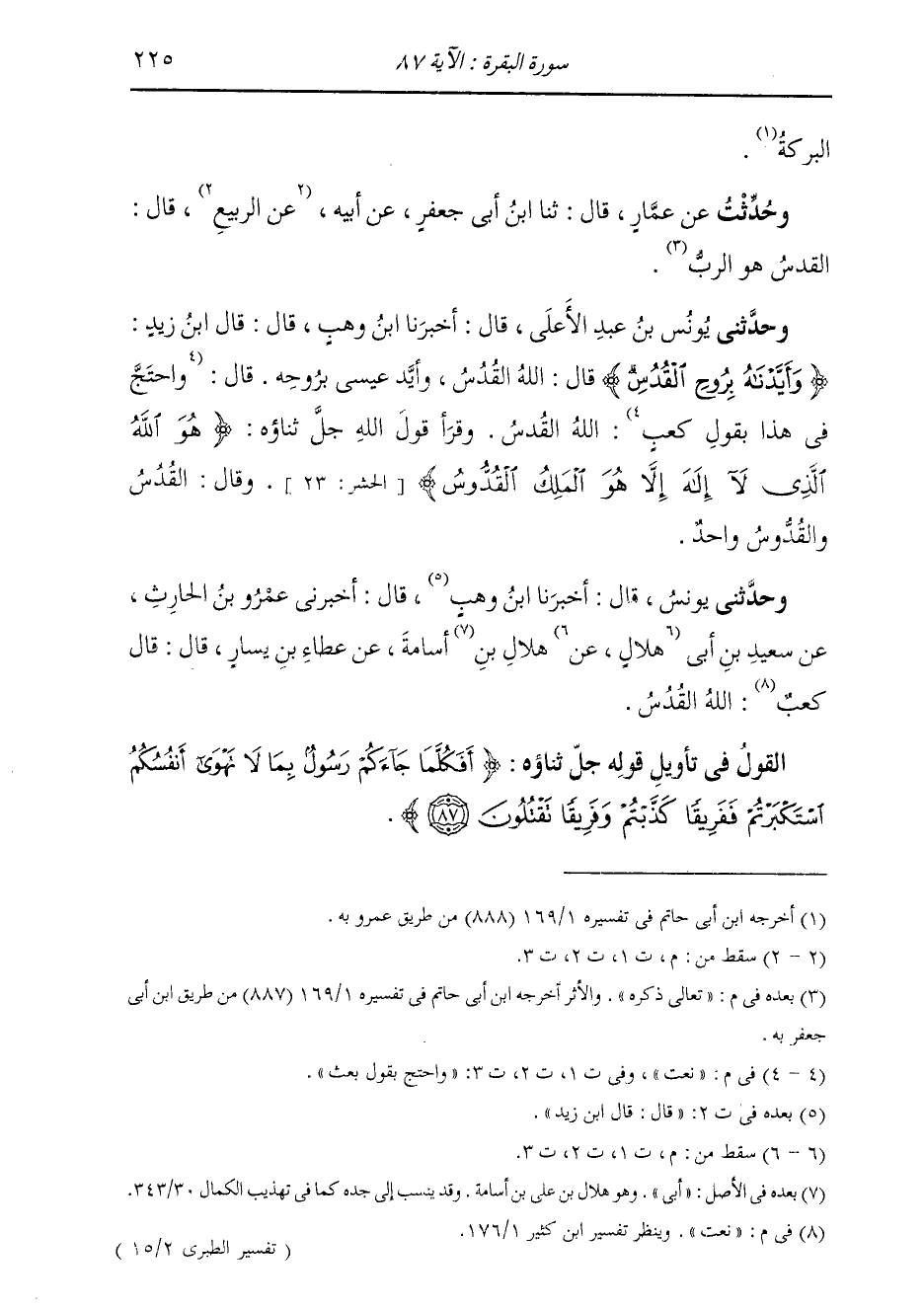 حَدَّثَنِي يُونُسُ، قَالَ: أَخْبَرَنَا ابْنُ وَهْبٍ، قَالَ: قَالَ ابْنُ زَيْدٍ: " {§وَأَيَّدْنَاهُ بِرُوحِ الْقُدُسِ} [البقرة: 87] قَالَ: اللَّهُ الْقُدُسُ، وَأُيِّدَ عِيسَى بِرُوحِهِ. قَالَ: نَعَتَ اللَّهُ الْقُدُسَ. وَقَرَأَ قَوْلَ اللَّهِ جَلَّ ثَنَاؤُهُ: {هُوَ اللَّهُ الَّذِي لَا إِلَهَ إِلَّا هُوَ الْمَلِكُ الْقُدُّوسُ} [الحشر: 23] قَالَ: الْقُدُسُ وَالْقُدُّوسُ وَاحِدٌ "