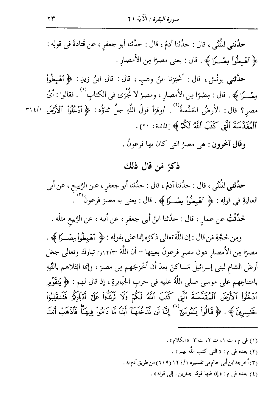 ذِكْرُ مَنْ قَالَ ذَلِكَ حَدَّثَنِي الْمُثَنَّى، ثنا آدَمَ، ثنا أَبُو جَعْفَرٍ، عَنِ الرَّبِيعِ، عَنْ أَبِي الْعَالِيَةِ: " فِي قَوْلِهِ: {§اهْبِطُوا مِصْرًا} [البقرة: 61] قَالَ: يَعْنِي بِهِ مِصْرَ فِرْعَوْنَ " حُدِّثْتُ عَنْ عَمَّارِ بْنِ الْحَسَنِ، عَنِ ابْنِ أَبِي جَعْفَرٍ، عَنْ أَبِيهِ، عَنِ الرَّبِيعِ، مِثْلَهُ وَمِنْ حُجَّةِ مَنْ قَالَ: إِنَّ اللَّهَ جَلَّ ثَنَاؤُهُ إِنَّمَا عَنَى بِقَوْلِهِ: {اهْبِطُوا مِصْرًا} [البقرة: 61] مِصْرًا مِنَ الْأَمْصَارِ دُونَ مِصْرَ فِرْعَوْنَ بِعَيْنِهَا، أَنَّ اللَّهَ جَعَلَ أَرْضَ الشَّامِ لِبَنِي إِسْرَائِيلَ مَسَاكِنَ بَعْدَ أَنْ أَخْرَجَهُمْ مِنْ مِصْرَ، وَإِنَّمَا ابْتَلَاهُمْ بِالتِّيهِ بِامْتِنَاعِهِمْ عَلَى مُوسَى فِي 4 حَرْبِ الْجَبَابِرَةِ إِذْ قَالَ لَهُمْ: {يَا قَوْمِ ادْخُلُوا الْأَرْضَ الْمُقَدَّسَةَ الَّتِي كَتَبَ اللَّهُ لَكُمْ وَلَا تَرْتَدُّوا عَلَى أَدْبَارِكُمْ فَتَنْقَلِبُوا خَاسِرِينَ قَالُوا يَا مُوسَى إِنَّ فِيهَا قَوْمًا جَبَّارِينَ} [المائدة: 22] إِلَى قَوْلِهِ: {إِنَّا لَنْ نَدْخُلَهَا أَبَدًا مَا دَامُوا فِيهَا فَاذْهَبْ أَنْتَ -[24]- وَرَبُّكَ فَقَاتِلَا إِنَّا هَاهُنَا قَاعِدُونَ} [المائدة: 24] فَحَرَّمَ اللَّهُ جَلَّ وَعَزَّ عَلَى قَائِلِ ذَلِكَ فِيمَا ذُكِرَ لَنَا دُخُولَهَا حَتَّى هَلَكُوا فِي التِّيهِ وَابْتَلَاهُمْ بِالتَّيَهَانِ فِي الْأَرْضِ أَرْبَعِينَ سَنَةً، ثُمَّ أَهْبَطَ ذُرَّيَّتَهُمْ الشَّامَ، فَأَسْكَنَهُمُ الْأَرْضَ الْمُقَدَّسَةَ، وَجَعَلَ هَلَاكَ الْجَبَابِرَةِ عَلَى أَيْدِيهِمْ مَعَ يُوشَعَ بْنِ نُونٍ بَعْدَ وَفَاةِ مُوسَى بْنِ عِمْرَانَ. فَرَأَيْنَا اللَّهَ جَلَّ وَعَزَّ قَدْ أَخْبَرَ عَنْهُمْ أَنَّهُ كَتَبَ لَهُمُ الْأَرْضَ الْمُقَدَّسَةَ وَلَمْ يُخْبِرْنَا عَنْهُمْ أَنَّهُ رَدَّهُمْ إِلَى مِصْرَ بَعْدَ إِخْرَاجِهِ إِيَّاهُمْ مِنْهَا، فَيَجُوزُ لَنَا أَنْ نَقْرَأَ اهْبِطُوا مِصْرًا، وَنَتَأَوَّلَهُ أَنَّهُ رَدَّهُمْ إِلَيْهَا. قَالُوا: فَإِنِ احْتَجَّ مُحْتَجٌّ بِقَوْلِ اللَّهِ جَلَّ ثَنَاؤُهُ: {فَأَخْرَجْنَاهُمْ مِنْ جَنَّاتٍ وَعُيُونٍ وَكُنُوزٍ وَمَقَامٍ كَرِيمٍ كَذَلِكَ وَأَوْرَثْنَاهَا بَنِي إِسْرَائِيلَ} [الشعراء: 57] قِيلَ لَهُمْ: فَإِنَّ اللَّهَ جَلَّ ثَنَاؤُهُ إِنَّمَا أَوْرَثَهُمْ ذَلِكَ فَمَلَّكَهُمْ إِيَّاهَا وَلَمْ يَرُدَّهُمْ إِلَيْهَا، وَجَعَلَ مَسَاكِنَهُمُ الشَّأْمَ. وَأَمَّا الَّذِينَ قَالُوا: إِنَّ اللَّهَ إِنَّمَا عَنَى بِقَوْلِهِ جَلَّ وَعَزَّ: {اهْبِطُوا مِصْرًا} [البقرة: 61] مِصْرَ، فَإِنَّ مِنْ حُجَّتِهِمُ الَّتِي احْتَجُّوا بِهَا الْآيَةُ الَّتِي قَالَ فِيهَا: {فَأَخْرَجْنَاهُمْ مِنْ جَنَّاتٍ وَعُيُونٍ وَكُنُوزٍ وَمَقَامٍ كَرِيمٍ كَذَلِكَ وَأَوْرَثْنَاهَا بَنِي إِسْرَائِيلَ} [الشعراء: 57] وَقَوْلُهُ: {كَمْ تَرَكُوا مِنْ جَنَّاتٍ وَعُيُونٍ وَزُرُوعٍ وَمَقَامٍ كَرِيمٍ وَنَعْمَةٍ كَانُوا فِيهَا فَاكِهِينَ كَذَلِكَ وَأَوْرَثْنَاهَا قَوْمًا آخَرِينَ} [الدخان: 25] قَالُوا: فَأَخْبَرَ اللَّهُ، جَلَّ ثَنَاؤُهُ أَنَّهُ قَدْ وَرَّثَهُمْ ذَلِكَ وَجَعَلَهَا لَهُمْ، فَلَمْ يَكُونُوا يَرِثُونَهَا ثُمَّ لَا يَنْتَفِعُونَ بِهَا. قَالُوا: وَلَا يَكُونُونَ مُنْتَفِعِينَ بِهَا إِلَّا بِمَصِيرِ بَعْضِهِمْ إِلَيْهَا، وَإِلَّا فَلَا وَجْهَ لِلِانْتِفَاعِ بِهَا إِنْ لَمْ يَصِيرُوا أَوْ يَصِرْ بَعْضُهُمْ إِلَيْهَا. -[25]- قَالُوا: وَأُخْرَى أَنَّهَا فِي قِرَاءَةِ أُبَيِّ بْنِ كَعْبٍ وَعَبْدِ اللَّهِ بْنِ مَسْعُودٍ: (اهْبِطُوا مِصْرَ) بِغَيْرِ أَلِفٍ، قَالُوا: فَفِي ذَلِكَ الدَّلَالَةُ الْبَيِّنَةُ أَنَّهَا مِصْرُ بِعَيْنِهَا. وَالَّذِي نَقُولُ بِهِ فِي ذَلِكَ أَنَّهُ لَا دَلَالَةَ فِي كِتَ