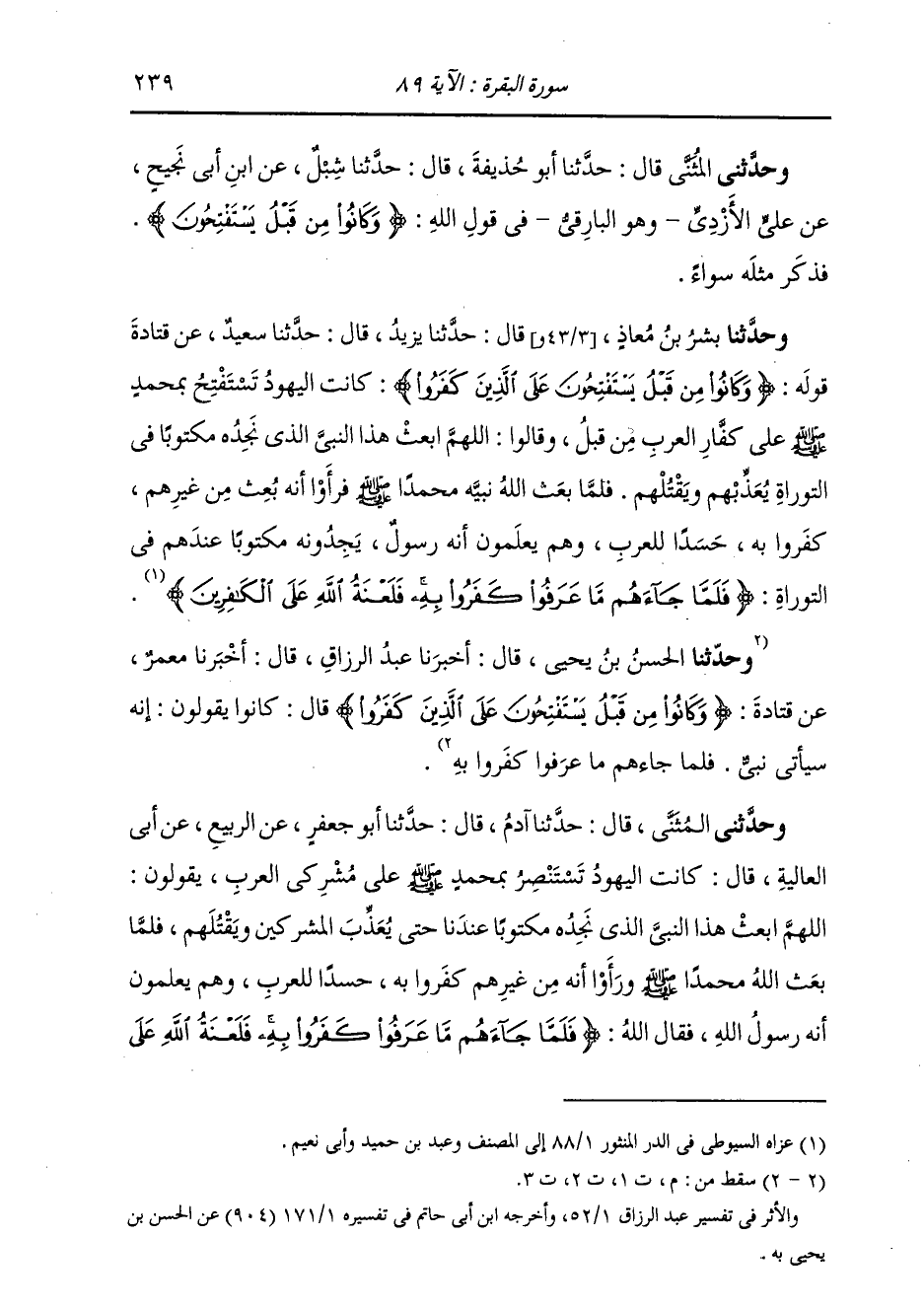 حَدَّثَنَا بِشْرُ بْنُ مُعَاذٍ، قَالَ: حَدَّثَنَا يَزِيدُ، قَالَ: حَدَّثَنَا سَعِيدٌ، عَنْ قَتَادَةَ: " قَوْلُهُ: {وَكَانُوا مِنْ قَبْلُ يَسْتَفْتِحُونَ عَلَى الَّذِينَ كَفَرُوا} [البقرة: 89] §كَانَتِ الْيَهُودُ تَسْتَفْتِحُ بِمُحَمَّدٍ صَلَّى اللهُ عَلَيْهِ وَسَلَّمَ عَلَى كُفَّارِ الْعَرَبِ مِنْ قَبْلُ، وَقَالُوا: اللَّهُمَّ ابْعَثْ هَذَا النَّبِيَّ الَّذِي نَجِدُهُ فِي التَّوْرَاةِ يُعَذِّبُهُمْ وَيَقْتُلُهُمْ. فَلَمَّا بَعَثَ اللَّهُ مُحَمَّدًا صَلَّى اللهُ عَلَيْهِ وَسَلَّمَ فَرَأَوْا أَنَّهُ بُعِثَ مِنْ غَيْرِهِمْ كَفَرُوا بِهِ حَسَدًا لِلْعَرَبِ، وَهُمْ يَعْلَمُونَ أَنَّهُ رَسُولُ اللَّهِ صَلَّى اللهُ عَلَيْهِ وَسَلَّمَ يَجِدُونَهُ مَكْتُوبًا عِنْدَهُمْ فِي التَّوْرَاةِ {فَلَمَّا جَاءَهُمْ مَا عَرَفُوا كَفَرُوا بِهِ} [البقرة: 89] "