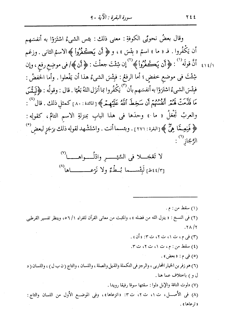 وَقَالَ بَعْضُ نَحْوِيِّي الْكُوفَةِ: مَعْنَى ذَلِكَ: بِئْسَ الشَّيْءُ اشْتَرُوا بِهِ أَنْفُسَهُمْ أَنْ يَكْفُرُوا، فَمَا اسْمُ بِئْسَ، وَأَنْ يَكْفُرُوا الِاسْمُ الثَّانِي. وَزَعَمَ أَنَّ أَنْ يُنَزِّلَ اللَّهُ مِنْ فَضْلِهِ إِنْ شِئْتَ جَعَلْتَ أَنْ فِي مَوْضِعِ رَفْعٍ، وَإِنْ شِئْتَ فِي مَوْضِعِ خَفْضٍ. أَمَّا الرَّفْعُ: فَبِئْسَ الشَّيْءُ هَذَا إِنْ فَعَلُوهُ؛ وَأَمَّا الْخَفْضُ: فَبِئْسَ الشَّيْءُ اشْتَرُوا بِهِ أَنْفُسَهُمْ أَنْ يَكْفُرُوا بِمَا أَنْزَلَ اللَّهُ بَغْيًا. قَالَ: وَقَوْلُهُ: {لَبِئْسَ مَا قَدَّمَتْ لَهُمْ أَنْفُسُهُمْ أَنْ سَخِطَ اللَّهُ عَلَيْهِمْ} [المائدة: 80] كَمِثْلِ ذَلِكَ. وَالْعَرَبُ تَجْعَلُ مَا وَحْدَهَا فِي هَذَا الْبَابِ بِمَنْزِلَةِ الِاسْمِ التَّامِّ كَقَوْلِهِ: {فَنِعِمَّا هِيَ} [البقرة: 271] وَبِئْسَمَا أَنْتَ. وَاسْتَشْهَدَ لِقَوْلِهِ ذَلِكَ بِرَجَزِ بَعْضِ الرُّجَّازِ: