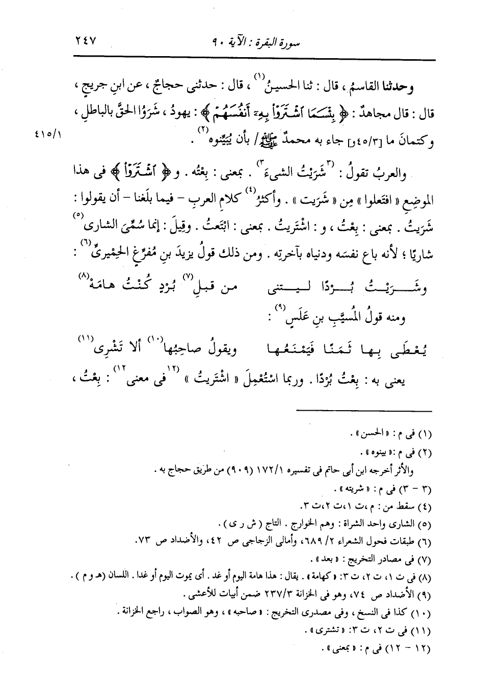 حَدَّثَنَا الْقَاسِمُ، قَالَ: ثنا الْحُسَيْنُ قَالَ: حَدَّثَنِي حَجَّاجٌ، عَنِ ابْنِ جُرَيْجٍ، قَالَ: قَالَ مُجَاهِدٌ: " {§بِئْسَمَا اشْتَرُوا بِهِ أَنْفُسَهُمْ} [البقرة: 90] يَهُودُ شَرَوُا الْحَقَّ بِالْبَاطِلِ وَكِتْمَانُ مَا جَاءَ بِهِ مُحَمَّدٌ صَلَّى اللهُ عَلَيْهِ وَسَلَّمَ بِأَنْ يُبَيِّنُوهُ " وَالْعَرَبُ تَقُولُ: شَرَيْتُهُ بِمَعْنَى بِعْتُهُ، وَاشْتَرُوا فِي هَذَا الْمَوْضِعِ افْتَعَلُوا مِنْ شَرَيْتُ. وَكَلَامُ الْعَرَبِ فِيمَا بَلَغَنَا أَنْ يَقُولُوا: شَرَيْتُ بِمَعْنَى بِعْتُ، وَاشْتَرَيْتُ بِمَعْنَى ابْتَعْتُ. وَقِيلَ إِنَّمَا سُمِّيَ الشَّارِي شَارِيًا لِأَنَّهُ بَاعَ نَفْسَهُ وَدُنْيَاهُ بِآخِرَتِهِ. وَمِنْ ذَلِكَ قَوْلُ يَزِيدَ بْنِ مُفَرِّغٍ الْحِمْيَرِيِّ: