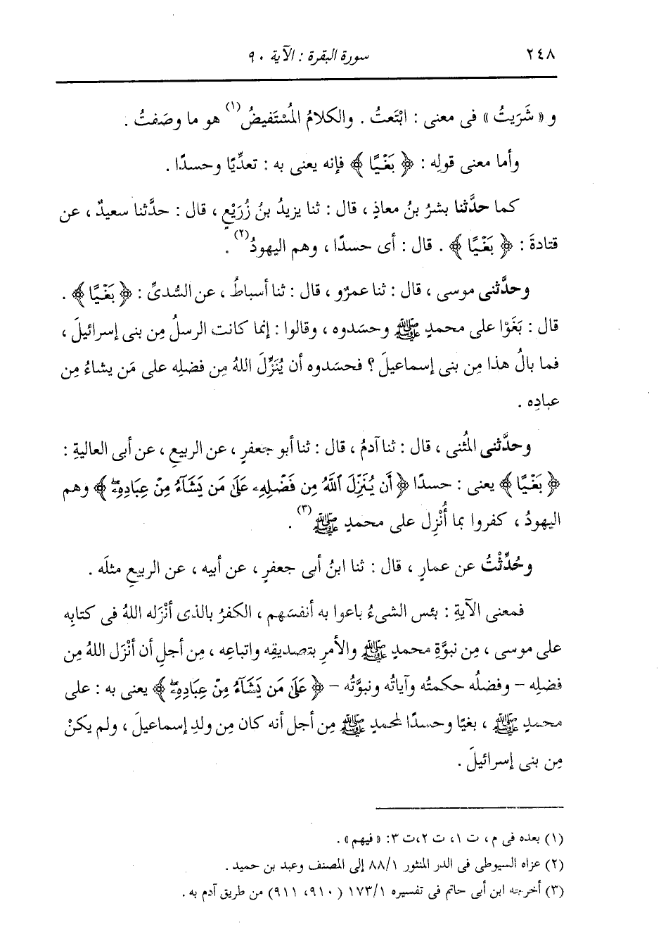 حَدَّثَنِي مُوسَى، قَالَ: ثنا عَمْرٌو، قَالَ: ثنا أَسْبَاطٌ، عَنِ السُّدِّيِّ: " {بَغْيًا} [البقرة: 90] قَالَ: §بَغَوْا عَلَى مُحَمَّدٍ صَلَّى اللهُ عَلَيْهِ وَسَلَّمَ وَحَسَدُوهُ، وَقَالُوا: إِنَّمَا كَانَتِ الرُّسُلُ مِنْ بَنِي إِسْرَائِيلَ، فَمَا بَالُ هَذَا مِنْ بَنِي إِسْمَاعِيلَ. فَحَسَدُوهُ أَنْ يُنَزِّلَ اللَّهُ مِنْ فَضْلِهِ عَلَى مَنْ يَشَاءُ مِنْ عِبَادِهِ "