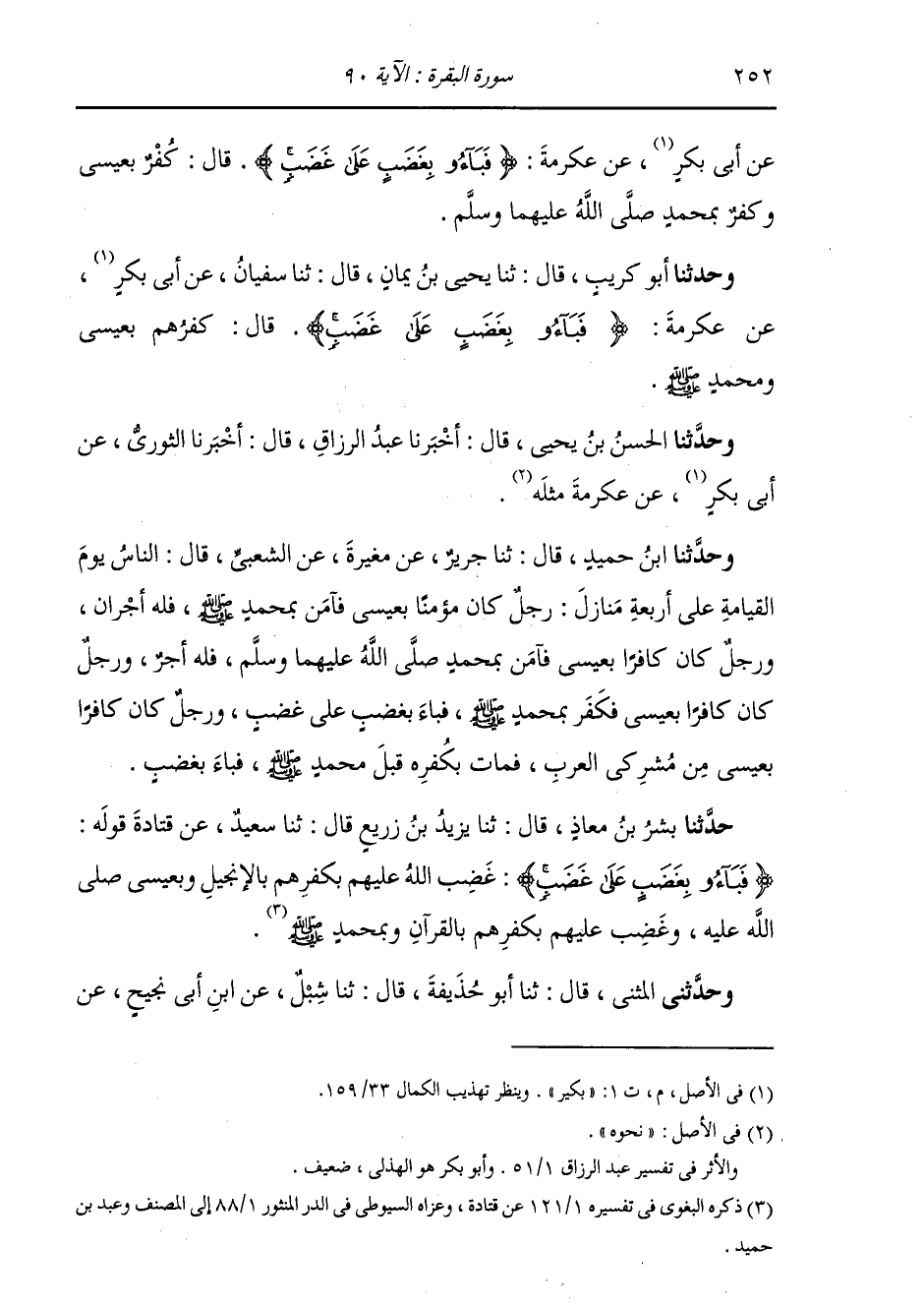 حَدَّثَنَا أَبُو كُرَيْبٍ، قَالَ: ثنا يَحْيَى بْنُ يَمَانٍ، قَالَ: ثنا سُفْيَانُ، عَنْ أَبِي بُكَيْرٍ، عَنْ عِكْرِمَةَ: " {§فَبَاءُوا بِغَضَبٍ عَلَى غَضَبٍ} قَالَ: كُفْرُهُمْ بِعِيسَى وَمُحَمَّدٍ صَلَّى اللهُ عَلَيْهِ وَسَلَّمَ " حَدَّثَنَا الْحَسَنُ بْنُ يَحْيَى، قَالَ: أَخْبَرَنَا عَبْدُ الرَّزَّاقِ، قَالَ: أَخْبَرَنَا الثَّوْرِيُّ، عَنْ أَبِي بُكَيْرٍ، عَنْ عِكْرِمَةَ مِثْلَهُ