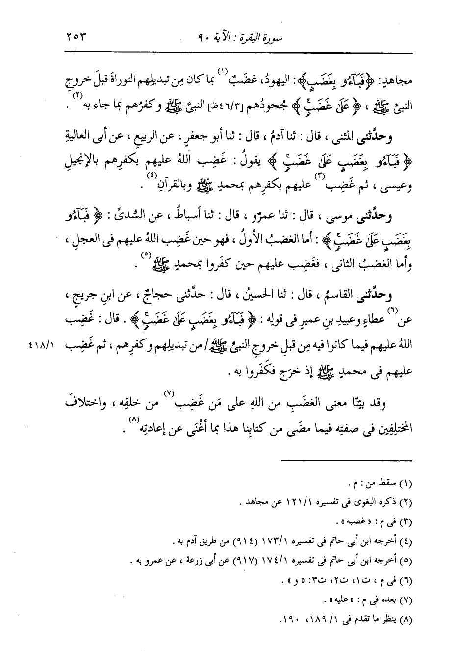 حَدَّثَنَا الْقَاسِمُ، قَالَ: ثنا الْحُسَيْنُ، قَالَ: حَدَّثَنِي حَجَّاجٌ، عَنِ ابْنِ جُرَيْجٍ، وَعَطَاءٍ، وَعُبَيْدِ بْنِ عُمَيْرٍ: " قَوْلُهُ: {فَبَاءُوا بِغَضَبٍ عَلَى غَضَبٍ} قَالَ: §غَضِبَ اللَّهُ عَلَيْهِمْ فِيمَا كَانُوا فِيهِ مِنْ قَبْلِ خُرُوجِ النَّبِيِّ صَلَّى اللهُ عَلَيْهِ وَسَلَّمَ مِنْ تَبْدِيلِهِمْ وَكُفْرِهِمْ، ثُمَّ غَضِبَ عَلَيْهِمْ فِي مُحَمَّدٍ صَلَّى اللهُ عَلَيْهِ وَسَلَّمَ إِذْ خَرَجَ فَكَفَرُوا بِهِ " قَالَ أَبُو جَعْفَرٍ: وَقَدْ بَيَّنَّا مَعْنَى الْغَضَبِ مِنَ اللَّهِ عَلَى مَنْ غَضِبَ عَلَيْهِ مِنْ خَلْقِهِ وَاخْتِلَافِ الْمُخْتَلِفِينَ فِي صِفَتِهِ فِيمَا مَضَى مِنْ كِتَابِنَا هَذَا بِمَا أَغْنَى عَنْ إِعَادَتِهِ، وَاللَّهُ تَعَالَى أَعْلَمُ