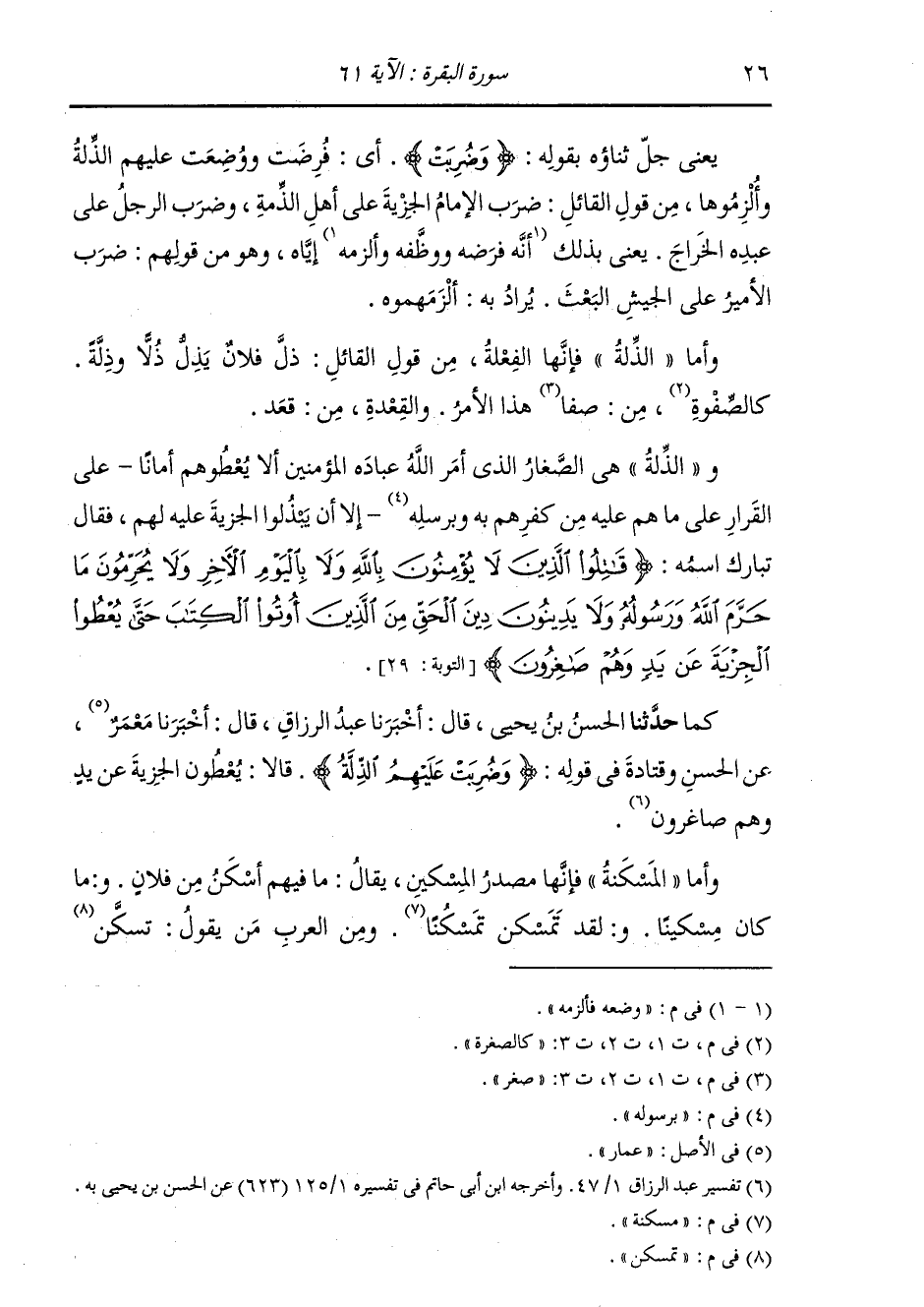 كَمَا حَدَّثَنَا الْحَسَنُ بْنُ يَحْيَى، قَالَ: أَخْبَرَنَا عَبْدُ الرَّزَّاقِ، قَالَ أَخْبَرَنَا مَعْمَرٌ، عَنِ الْحَسَنِ، وَقَتَادَةَ: " فِي قَوْلِهِ: {§وَضُرِبَتْ عَلَيْهِمُ الذِّلَّةُ} [البقرة: 61] قَالَا: يُعْطُونَ الْجِزْيَةَ عَنْ يَدٍ وَهُمْ صَاغِرُونَ " وَأَمَّا الْمَسْكَنَةُ، فَإِنَّهَا مَصْدَرُ الْمِسْكِينِ، يُقَالُ: مَا فِيهِمْ أَسْكَنُ مِنْ فُلَانٍ وَمَا كَانَ مِسْكِينًا وَلَقَدْ تَمَسْكَنَ مَسْكَنَةً وَمِنَ الْعَرَبِ مَنْ يَقُولُ تَمَسْكَنَ -[27]- تَمَسْكُنًا. وَالْمَسْكَنَةُ فِي هَذَا الْمَوْضِعِ مَسْكَنَةُ الْفَاقَةِ وَالْحَاجَةِ، وَهِيَ خُشُوعُهَا وَذُلُّهَا
