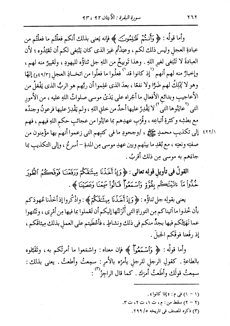 §الْقَوْلُ فِي تَأْوِيلِ قَوْلِهِ تَعَالَى: {وَإِذْ أَخَذْنَا مِيثَاقَكُمْ وَرَفَعْنَا فَوْقَكُمُ الطُّورَ خُذُوا مَا آتَيْنَاكُمْ بِقُوَّةٍ وَاسْمَعُوا قَالُوا سَمِعْنَا وَعَصَيْنَا وَأُشْرِبُوا فِي قُلُوبِهِمُ الْعِجْلَ بِكُفْرِهِمْ قُلْ بِئْسَمَا يَأْمُرُكُمْ بِهِ إِيمَانُكُمْ إِنْ كُنْتُمْ مُؤْمِنِينَ} [البقرة: 93]