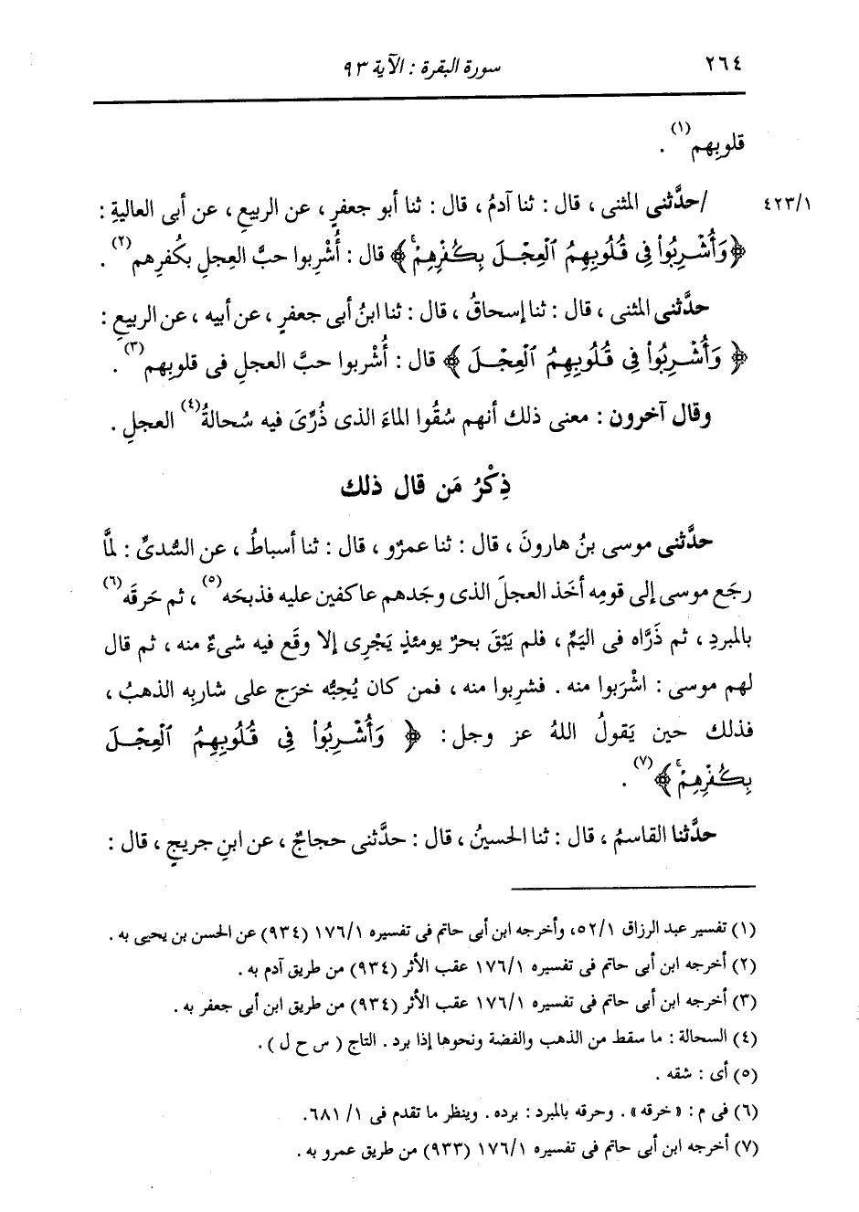 حَدَّثَنِي الْمُثَنَّى، قَالَ: ثنا آدَمَ، قَالَ: ثنا أَبُو جَعْفَرٍ، عَنِ الرَّبِيعِ، عَنْ أَبِي الْعَالِيَةِ: " {وَأُشْرِبُوا فِي قُلُوبِهِمُ الْعِجْلَ} [البقرة: 93] قَالَ: §أُشْرِبُوا حُبَّ الْعِجْلِ بِكُفْرِهِمْ "