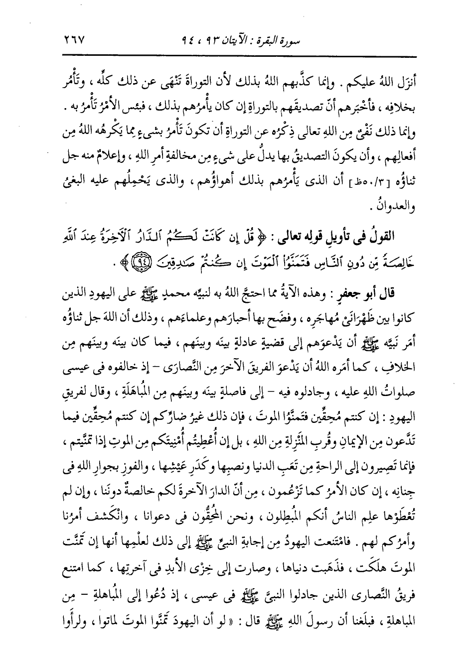 §الْقَوْلُ فِي تَأْوِيلِ قَوْلِهِ تَعَالَى: {قُلْ إِنْ كَانَتْ لَكُمُ الدَّارُ الْآخِرَةُ عِنْدَ اللَّهِ خَالِصَةً مِنْ دُونِ النَّاسِ فَتَمَنَّوُا الْمَوْتَ إِنْ كُنْتُمْ صَادِقِينَ} [البقرة: 94] قَالَ أَبُو جَعْفَرٍ: وَهَذِهِ الْآيَةُ مِمَّا احْتَجَّ اللَّهُ بِهَا لِنَبِيِّهِ مُحَمَّدٍ صَلَّى اللهُ عَلَيْهِ وَسَلَّمَ عَلَى الْيَهُودِ الَّذِينَ كَانُوا بَيْنَ ظَهْرَانَيْ مُهَاجَرَهِ، وَفَضَحَ بِهَا أَحْبَارَهُمْ وَعُلَمَاءَهُمْ. وَذَلِكَ أَنَّ اللَّهَ جَلَّ ثَنَاؤُهُ أَمَرَ نَبِيَّهُ صَلَّى اللهُ عَلَيْهِ وَسَلَّمَ أَنْ يَدْعُوَهُمْ إِلَى قَضِيَّةٍ عَادِلَةٍ بَيْنَهُ وَبَيْنَهُمْ فِيمَا كَانَ بَيْنَهُ وَبَيْنَهُمْ مِنَ الْخِلَافِ، كَمَا أَمَرَهُ اللَّهُ أَنْ يَدْعُوَ الْفَرِيقَ الْآخَرَ مِنَ النَّصَارَى إِذْ خَالَفُوهُ فِي عِيسَى صَلَوَاتُ اللَّهِ عَلَيْهِ وَجَادَلُوا فِيهِ إِلَى فَاصِلَةٍ بَيْنَهُ وَبَيْنَهُمْ مِنَ الْمُبَاهَلَةِ. وَقَالَ لِفَرِيقِ الْيَهُودِ: إِنْ كُنْتُمْ مُحِقِّينَ فَتَمَنَّوُا الْمَوْتَ، فَإِنَّ ذَلِكَ غَيْرُ ضَارِّكُمْ إِنْ كُنْتُمْ مُحِقِّينَ فِيمَا تَدَّعُونَ مِنَ الْإِيمَانِ وَقُرْبِ الْمَنْزِلَةِ مِنَ اللَّهِ، بَلْ إِنْ أُعْطِيتُمْ أُمْنِيَّتَكُمْ مِنَ الْمَوْتِ إِذَا تَمَنَّيْتُمْ فَإِنَّمَا تَصِيرُونَ إِلَى الرَّاحَةِ مِنْ تَعِبِ الدُّنْيَا وَنَصَبِهَا وَكَدَرِ عَيْشِهَا وَالْفَوْزِ بِجِوَارِ اللَّهِ فِي جِنَانِهِ، إِنْ كَانَ الْأَمْرُ كَمَا تَزْعُمُونَ أَنَّ الدَّارَ الْآخِرَةَ لَكُمْ خَالِصَةً دُونَنَا. وَإِنْ لَمْ تُعْطَوْهَا عَلِمَ النَّاسُ أَنَّكُمُ الْمُبْطِلُونَ وَنَحْنُ الْمُحِقُّونَ فِي دَعْوَانَا وَانْكَشَفَ أَمْرُنَا وَأَمْرُكُمْ لَهُمْ. فَامْتَنَعَتِ الْيَهُودُ مِنْ إِجَابَةِ النَّبِيِّ صَلَّى اللهُ عَلَيْهِ وَسَلَّمَ إِلَى ذَلِكَ؛ لِعِلْمِهَا أَنَّهَا إِنْ تَمَنَّتِ الْمَوْتَ هَلَكَتْ فَذَهَبَتْ دُنْيَاهَا وَصَارَتْ إِلَى خِزْيِ الْأَبَدِ فِي آخِرَتِهَا. كَمَا امْتَنَعَ فَرِيقُ النَّصَارَى الَّذِينَ جَادَلُوا النَّبِيَّ صَلَّى اللهُ عَلَيْهِ وَسَلَّمَ فِي عِيسَى، إِذْ دُعُوا إِلَى الْمُبَاهَلَةِ، مِنَ الْمُبَاهَلَةِ