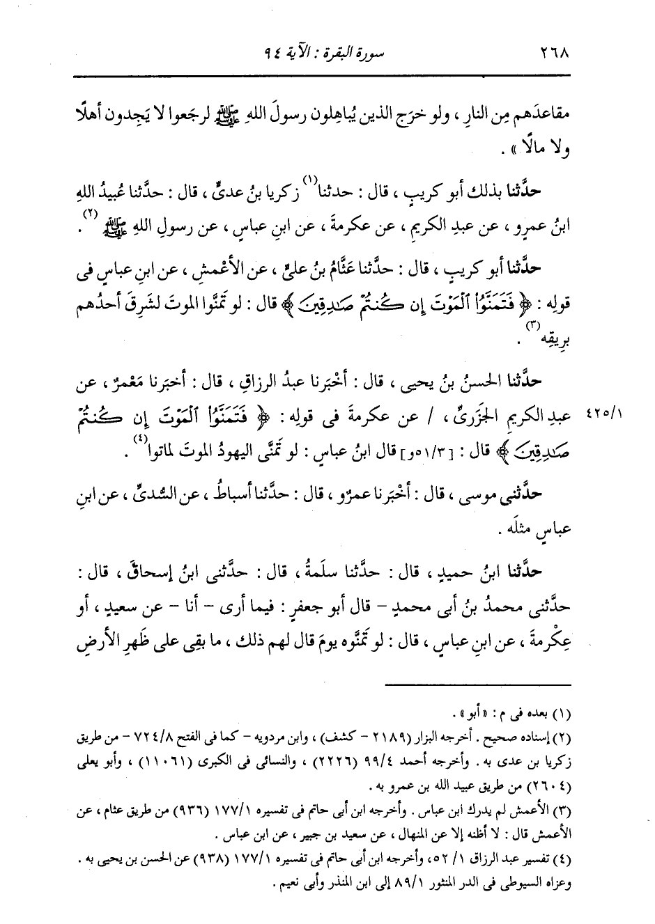 حَدَّثَنَا الْحَسَنُ بْنُ يَحْيَى، قَالَ: أَخْبَرَنَا عَبْدُ الرَّزَّاقِ، قَالَ: أَخْبَرَنَا مَعْمَرٌ، عَنْ عَبْدِ الْكَرِيمِ الْجَزَرِيِّ، عَنْ عِكْرِمَةَ، فِي قَوْلِهِ: {فَتَمَنَّوُا الْمَوْتَ إِنْ كُنْتُمْ صَادِقِينَ} [البقرة: 94] قَالَ: قَالَ ابْنُ عَبَّاسٍ: «§لَوْ تَمَنَّى الْيَهُودُ الْمَوْتَ لَمَاتُوا» حَدَّثَنِي مُوسَى، قَالَ: أَخْبَرَنَا عَمْرِوٌ، قَالَ: حَدَّثَنَا أَسْبَاطٌ، عَنِ السُّدِّيِّ، عَنِ ابْنِ عَبَّاسٍ، مِثْلَهُ