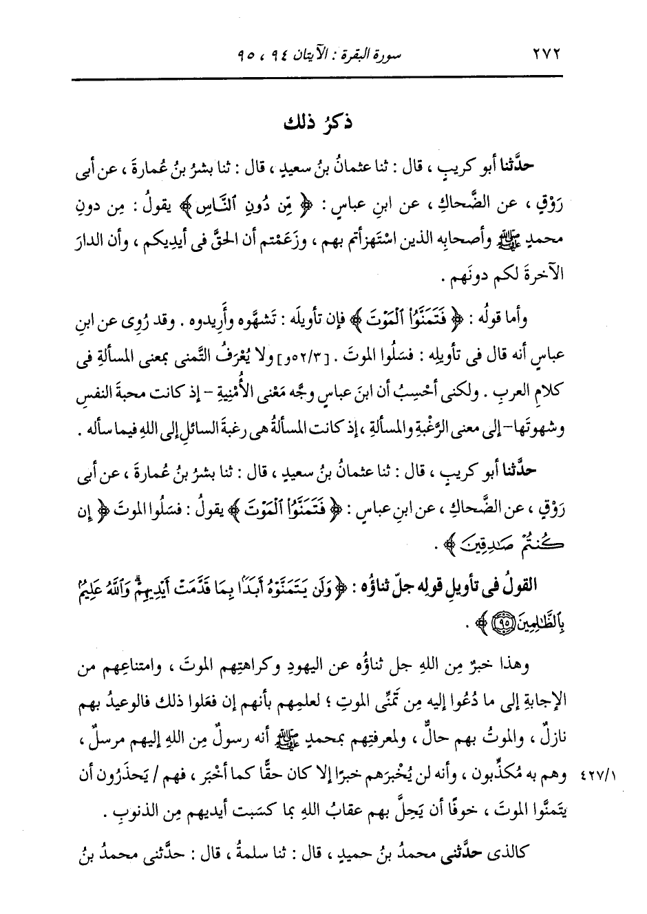 §الْقَوْلُ فِي تَأْوِيلِ قَوْلِهِ تَعَالَى: {وَلَنْ يَتَمَنَّوْهُ أَبَدًا بِمَا قَدَّمَتْ أَيْدِيهِمْ وَاللهُ عَلِيمٌ بِالظَّالِمِينَ} [البقرة: 95] وَهَذَا خَبَرٌ مِنَ اللَّهِ جَلَّ ثَنَاؤُهُ عَنِ الْيَهُودِ وَكَرَاهَتِهِمُ الْمَوْتَ وَامْتِنَاعِهِمْ عَنِ الْإِجَابَةِ إِلَى مَا دُعُوا إِلَيْهِ مِنْ تَمَنِّي الْمَوْتِ، لِعِلْمِهِمْ بِأَنَّهُمْ إِنْ فَعَلُوا ذَلِكَ فَالْوَعِيدُ بِهِمْ نَازِلٌ وَالْمَوْتُ بِهِمْ حَالٌّ، وَلِمَعْرِفَتِهِمْ بِمُحَمَّدٍ صَلَّى اللهُ عَلَيْهِ وَسَلَّمَ أَنَّهُ رَسُولٌ مِنَ اللَّهِ إِلَيْهِمْ مُرْسَلٌ وَهُمْ بِهِ مُكَذِّبُونَ، وَأَنَّهُ لَمْ يُخْبِرْهُمْ خَبَرًا إِلَّا كَانَ حَقًّا كَمَا أَخْبَرَ، فَهُمْ يَحْذَرُونَ أَنْ يَتَمَنَّوُا الْمَوْتَ خَوْفًا أَنْ يَحِلَّ بِهِمْ عِقَابُ اللَّهِ بِمَا كَسَبَتْ أَيْدِيهِمْ مِنَ الذُّنُوبِ
