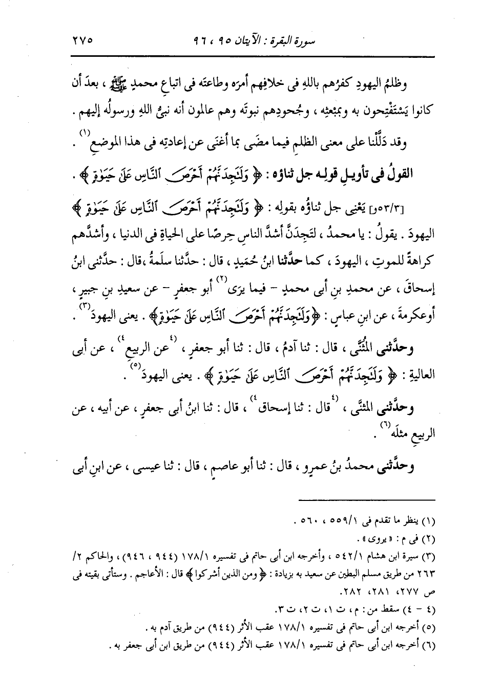 حَدَّثَنِي الْمُثَنَّى، قَالَ: ثنا آدَمَ، قَالَ: ثنا أَبُو جَعْفَرٍ، عَنْ أَبِي الْعَالِيَةِ: " {§وَلَتَجِدَنَّهُمْ أَحْرَصَ النَّاسِ عَلَى حَيَاةٍ} [البقرة: 96] يَعْنِي الْيَهُودَ " حَدَّثَنِي الْمُثَنَّى، قَالَ: ثنا ابْنُ أَبِي جَعْفَرٍ، عَنْ أَبِيهِ، عَنِ الرَّبِيعِ، مِثْلَهُ حَدَّثَنِي مُحَمَّدُ بْنُ عَمْرٍو، قَالَ: ثنا أَبُو عَاصِمٍ، قَالَ: ثنا عِيسَى، عَنِ ابْنِ أَبِي -[276]- نَجِيحٍ، عَنْ مُجَاهِدٍ، مِثْلَهُ وَإِنَّمَا كَرَاهَتُهُمُ الْمَوْتَ لِعِلْمِهِمْ بِمَا لَهُمْ فِي الْآخِرَةِ مِنَ الْخِزْيِ وَالْهَوَانِ الطَّوِيلِ