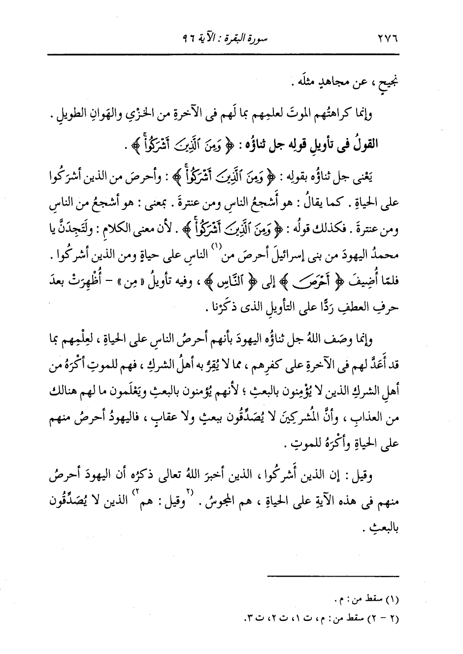 §الْقَوْلُ فِي تَأْوِيلِ قَوْلِهِ تَعَالَى: {وَمِنَ الَّذِينَ أَشْرَكُوا} [البقرة: 96] يَعْنِي جَلَّ ثَنَاؤُهُ بِقَوْلِهِ: {وَمِنَ الَّذِينَ أَشْرَكُوا} [البقرة: 96] وَأَحْرَصَ مِنَ الَّذِينَ أَشْرَكُوا عَلَى الْحَيَاةِ، كَمَا يُقَالُ: هُوَ أَشْجَعُ النَّاسِ وَمِنْ عَنْتَرَةَ، بِمَعْنَى: هُوَ أَشْجَعُ مِنَ النَّاسِ وَمِنْ عَنْتَرَةَ، فَكَذَلِكَ قَوْلُهُ: {وَمِنَ الَّذِينَ أَشْرَكُوا} [البقرة: 96] لِأَنَّ مَعْنَى الْكَلَامِ: ولَتَجِدَنَّ يَا مُحَمَّدُ الْيَهُودَ مِنْ بَنِي إِسْرَائِيلَ أَحْرَصَ النَّاسِ عَلَى حَيَاةٍ وَمِنَ الَّذِينَ أَشْرَكُوا. فَلَمَّا أُضِيفَ أَحْرَصُ إِلَى النَّاسِ، وَفِيهِ تَأْوِيلُ مِنْ أُظْهِرَتْ بَعْدَ حَرْفِ الْعَطْفِ رَدًّا عَلَى التَّأْوِيلِ الَّذِي ذَكَرْنَاهُ. وَإِنَّمَا وَصَفَ اللَّهُ جَلَّ ثَنَاؤُهُ الْيَهُودَ بِأَنَّهُمْ أَحْرَصُ النَّاسِ عَلَى الْحَيَاةِ لِعِلْمِهِمْ بِمَا قَدْ أَعَدَّ لَهُمْ فِي الْآخِرَةِ عَلَى كُفْرِهِمْ بِمَا لَا يُقِرُّ بِهِ أَهْلُ الشِّرْكِ، فَهُمْ لِلْمَوْتِ أَكْرَهُ مِنْ أَهْلِ الشِّرْكِ الَّذِينَ لَا يُؤْمِنُونَ بِالْبَعْثِ؛ لِأَنَّهُمْ يُؤْمِنُونَ بِالْبَعْثِ، وَيَعْلَمُونَ مَا لَهُمْ هُنَالِكَ مِنَ الْعَذَابِ، وَأَنَّ الْمُشْرِكِينَ لَا يُصَدِّقُونَ بِالْبَعْثِ، وَلَا الْعِقَابِ. فَالْيَهُودُ أَحْرَصُ مِنْهُمْ عَلَى الْحَيَاةِ وَأَكْرَهُ لِلْمَوْتِ. وَقِيلَ: إِنَّ الَّذِينَ أَشْرَكُوا الَّذِينَ أَخْبَرَ اللَّهُ تَعَالَى ذِكْرُهُ أَنَّ الْيَهُودَ أَحْرَصُ مِنْهُمْ فِي هَذِهِ الْآيَةِ عَلَى الْحَيَاةِ هُمُ الْمَجُوسُ الَّذِينَ لَا يُصَدِّقُونَ بِالْبَعْثِ.