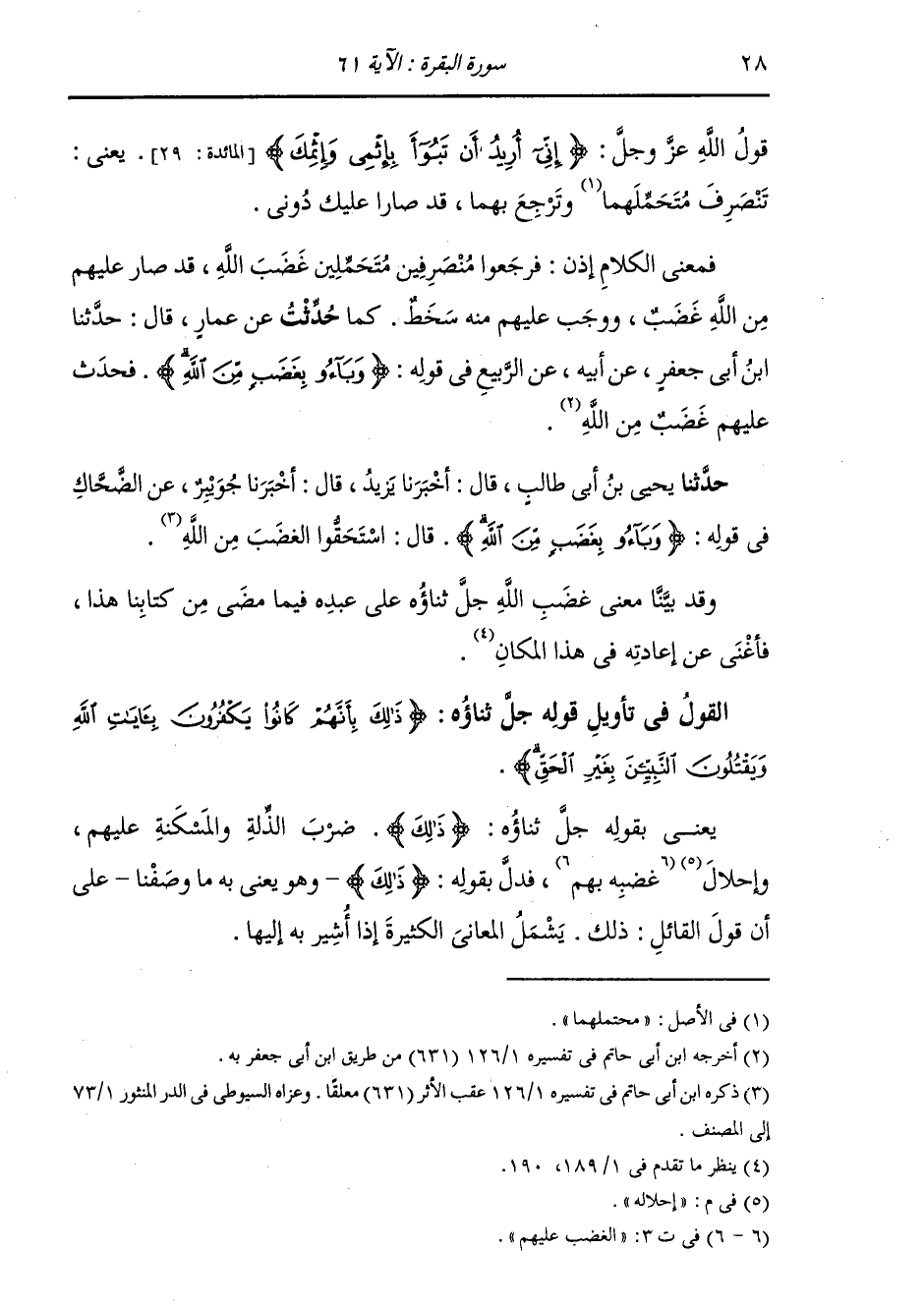 حَدَّثَنَا يَحْيَى بْنُ أَبِي طَالِبٍ، قَالَ: أَخْبَرَنَا يَزِيدُ، قَالَ: أَخْبَرَنَا جُوَيْبِرٌ، عَنِ الضَّحَّاكِ: " فِي قَوْلِهِ: {§وَبَاءُوا بِغَضَبٍ مِنَ اللَّهِ} قَالَ: اسْتَحَقُّوا الْغَضَبَ مِنَ اللَّهِ " وَقَدَّمْنَا مَعْنَى غَضَبِ اللَّهِ عَلَى عَبْدِهِ فِيمَا مَضَى مِنْ كِتَابِنَا هَذَا، فَأَغْنَى عَنْ إِعَادَتِهِ فِي هَذَا الْمَوْضِعِ