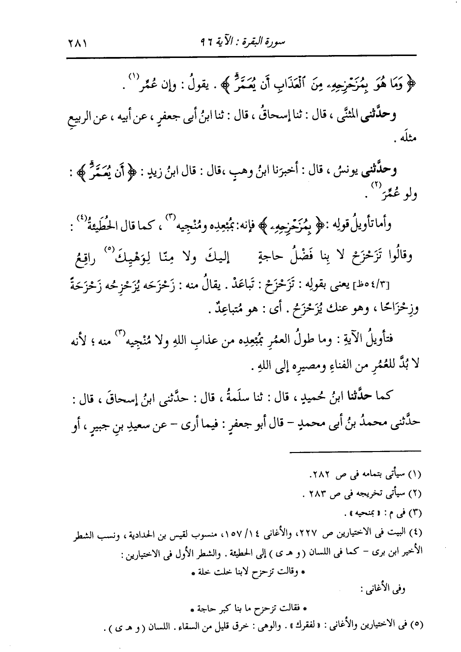 حَدَّثَنِي يُونُسُ، قَالَ: أَخْبَرَنَا ابْنُ وَهْبٍ، قَالَ: قَالَ ابْنُ زَيْدٍ: «§أَنْ يُعَمَّرَ، وَلَوْ عُمِّرَ» وَأَمَّا تَأْوِيلُ قَوْلِهِ: {بِمُزَحْزِحِهِ} [البقرة: 96] فَإِنَّهُ بِمُبْعِدِهِ وَمُنَحِّيهِ، كَمَا قَالَ الْحُطَيْئَةُ:
