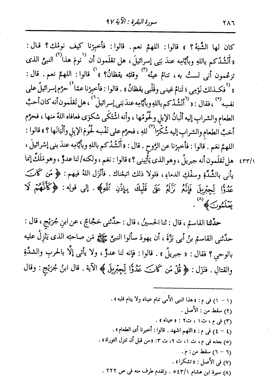 حَدَّثَنَا الْقَاسِمُ، قَالَ: ثنا الْحُسَيْنُ، قَالَ: حَدَّثَنِي حَجَّاجٌ، عَنِ ابْنِ جُرَيْجٍ، قَالَ: حَدَّثَنِي الْقَاسِمُ بْنُ أَبِي بَزَّةَ: " أَنْ يَهُودَ، سَأَلُوا النَّبِيَّ صَلَّى اللهُ عَلَيْهِ وَسَلَّمَ مَنْ صَاحِبُهُ الَّذِي يَنْزِلُ عَلَيْهِ بِالْوَحْيِ، فَقَالَ: «جِبْرِيلُ» قَالُوا: §فَإِنَّهُ لَنَا عَدُوٌّ وَلَا يَأْتِي إِلَّا بِالْحَرْبِ وَالشِّدَّةِ وَالْقِتَالِ. فَنَزَلَ: {مَنْ كَانَ عَدُوًّا لِجِبْرِيلَ} [البقرة: 97] الْآيَةُ "
