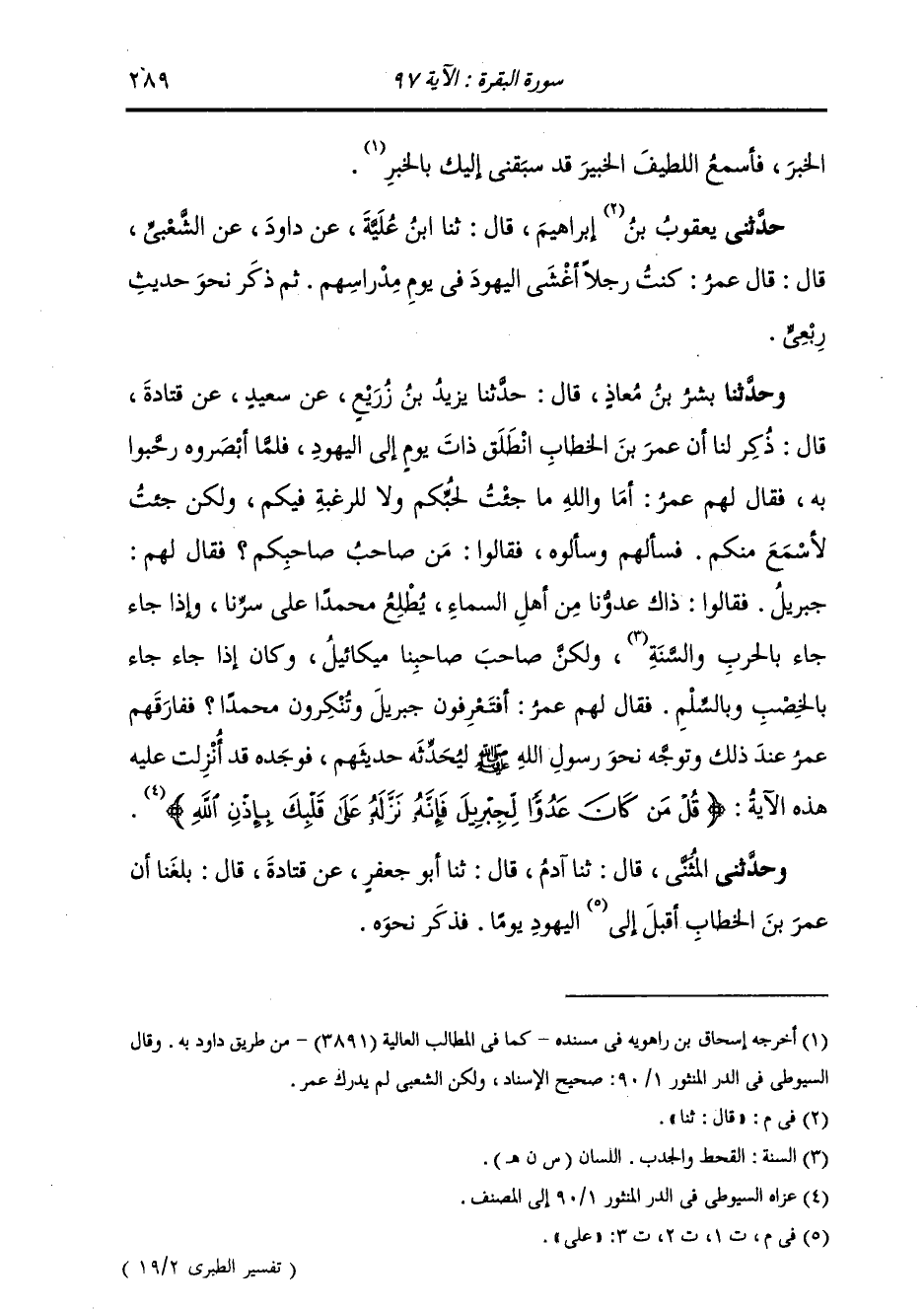 حَدَّثَنَا بِشْرُ بْنُ مُعَاذٍ، قَالَ ثنا يَزِيدُ بْنُ زُرَيْعٍ، قَالَ: ثنا سَعِيدٌ، عَنْ قَتَادَةَ، قَالَ: ذُكِرَ لَنَا أَنَّ عُمَرَ بْنَ الْخَطَّابِ، انْطَلَقَ ذَاتَ يَوْمٍ إِلَى الْيَهُودِ، فَلَمَّا أَبْصَرُوهُ رَحَّبُوا بِهِ، فَقَالَ لَهُمْ عُمَرُ: " أَمَا وَاللَّهِ §مَا جِئْتُ لِحُبِّكُمْ وَلَا لِلرَّغْبَةِ فِيكُمْ، وَلَكِنْ جِئْتُ لِأَسْمَعَ مِنْكُمْ. فَسَأَلَهُمْ وَسَأَلُوهُ، فَقَالُوا مِنْ صَاحِبُ صَاحِبِكُمْ؟ فَقَالَ لَهُمْ: جِبْرِيلُ. فَقَالُوا: ذَاكَ عَدُوُّنَا مِنْ أَهْلِ السَّمَاءِ يُطْلِعُ مُحَمَّدًا عَلَى سِرِّنَا، وَإِذَا جَاءَ جَاءَ بِالْحَرْبِ وَالسَّنَةِ، وَلَكِنَّ صَاحِبَ صَاحِبِنَا مِيكَائِيلُ، وَكَانَ إِذَا جَاءَ جَاءَ بِالْخَصْبِ وَبِالسِّلْمِ، فَقَالَ لَهُمْ عُمَرُ: أَفَتَعْرِفُونَ جِبْرِيلَ وَتُنْكِرُونَ مُحَمَّدًا. فَفَارَقَهُمْ عُمَرُ عِنْدَ ذَلِكَ وَتَوَجَّهَ نَحْوَ رَسُولِ اللَّهِ صَلَّى اللهُ عَلَيْهِ وَسَلَّمَ لِيُحَدِّثَهُ حَدِيثَهُمْ، فَوَجَدَهُ قَدْ أُنْزِلَ عَلَيْهِ هَذِهِ الْآيَةُ: {قُلْ مَنْ كَانَ عَدُوًّا لِجِبْرِيلَ فَإِنَّهُ نَزَّلَهُ عَلَى قَلْبِكَ بِإِذْنِ اللَّهِ} [البقرة: 97] " حَدَّثَنِي الْمُثَنَّى، قَالَ: ثنا آدَمَ، قَالَ: ثنا أَبُو جَعْفَرٍ عَنْ قَتَادَةَ، قَالَ: بَلَغَنَا أَنَّ عُمَرَ بْنَ الْخَطَّابِ أَقْبَلَ عَلَى الْيَهُودِ يَوْمًا فَذَكَرَ نَحْوَهُ