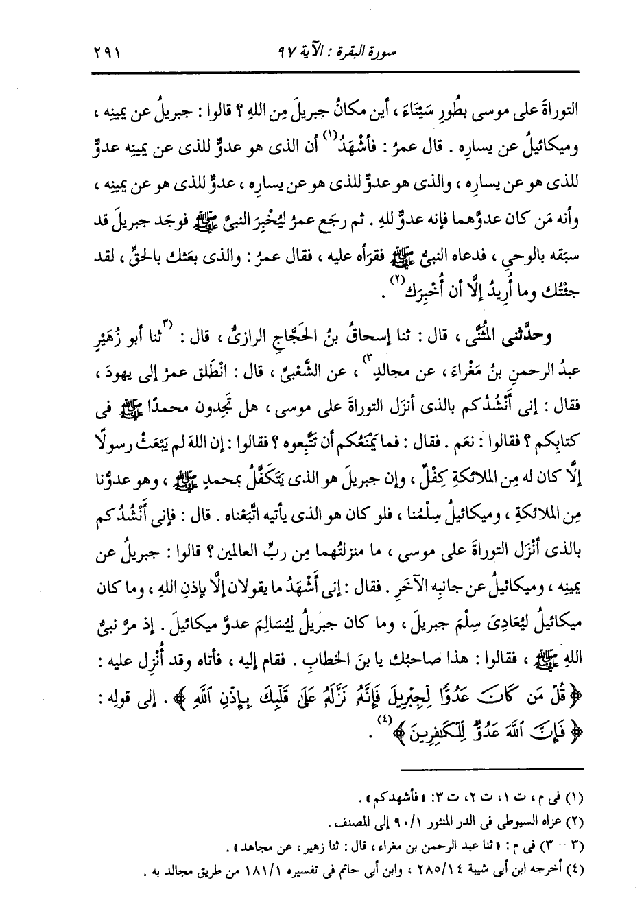 حَدَّثَنِي الْمُثَنَّى، قَالَ: ثنا إِسْحَاقُ بْنُ الْحَجَّاجِ الرَّازِيُّ، قَالَ: ثنا عَبْدُ الرَّحْمَنِ بْنُ مَغْرَاءَ، قَالَ: ثنا زُهَيْرٌ، عَنْ مُجَالِدَ، عَنْ الشَّعْبِيِّ، قَالَ: انْطَلَقَ عُمَرُ إِلَى يَهُودَ، فَقَالَ: " §إِنِّي أَنْشُدُكُمْ بِالَّذِي أَنْزَلَ التَّوْرَاةَ عَلَى مُوسَى هَلْ تَجِدُونَ مُحَمَّدًا فِي كِتَابِكُمْ؟ قَالُوا: نَعَمْ. قَالَ: فَمَا يَمْنَعُكُمْ أَنْ تَتَّبِعُوهُ؟ قَالُوا: إِنَّ اللَّهَ لَمْ يَبْعَثْ رَسُولًا إِلَّا كَانَ لَهُ كِفْلٌ مِنَ الْمَلَائِكَةِ، وَإِنَّ جِبْرِيلَ هُوَ الَّذِي يَتَكَفَّلُ لِمُحَمَّدٍ، وَهُوَ عَدُوُّنَا مِنَ الْمَلَائِكَةِ، وَمِيكَائِيلُ سِلْمُنَا؛ فَلَوْ كَانَ هُوَ الَّذِي يَأْتِيهِ اتَّبَعْنَاهُ. قَالَ: فَإِنِّي أَنْشُدُكُمْ بِالَّذِي أَنْزَلَ التَّوْرَاةَ عَلَى مُوسَى، مَا مَنْزِلَتُهُمَا مِنْ رَبِّ الْعَالَمِينَ؟ قَالُوا: جِبْرِيلُ عَنْ يَمِينِهِ، وَمِيكَائِيلُ عَنْ جَانِبِهِ الْآخَرِ. فَقَالَ: إِنِّي أَشْهَدُ مَا يَقُولَانِ إِلَّا بِإِذْنِ اللَّهِ، وَمَا كَانَ لِمِيكَائِيلَ أَنْ يُعَادِيَ سِلْمَ جِبْرِيلَ، وَمَا كَانَ جِبْرِيلُ لِيُسَالِمَ عَدُوَّ مِيكَائِيلَ. فَبَيْنَمَا هُوَ عِنْدَهُمْ إِذْ مَرَّ نَبِيُّ اللَّهِ صَلَّى اللهُ عَلَيْهِ وَسَلَّمَ، فَقَالُوا: هَذَا صَاحِبُكَ يَا ابْنَ الْخَطَّابِ. فَقَامَ إِلَيْهِ فَأَتَاهُ وَقَدْ أُنْزِلَ عَلَيْهِ: {مَنْ كَانَ عَدُوًّا لِجِبْرِيلَ فَإِنَّهُ نَزَّلَهُ عَلَى قَلْبِكَ بِإِذْنِ اللَّهِ} [البقرة: 97] إِلَى قَوْلِهِ: {فَإِنَّ اللَّهَ عَدُوٌّ لِلْكَافِرِينَ} [البقرة: 98] "