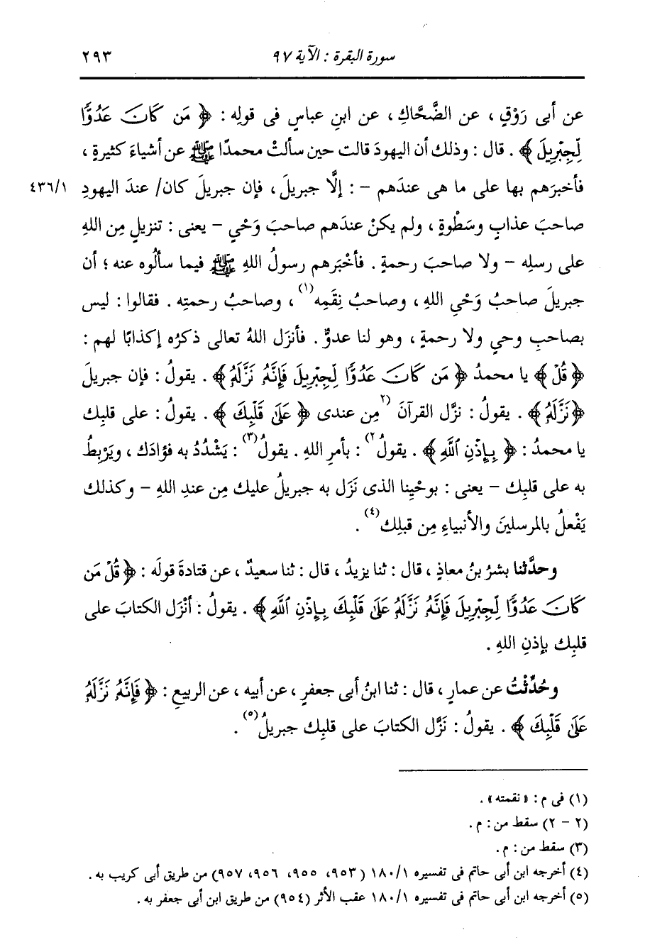عَنْ أَبِي رَوْقٍ، عَنِ الضَّحَّاكِ، عَنِ ابْنِ عَبَّاسٍ: " فِي قَوْلِهِ: {قُلْ مَنْ كَانَ عَدُوًّا لِجِبْرِيلَ} [البقرة: 97] قَالَ: وَذَلِكَ أَنَّ الْيَهُودَ قَالَتْ حِينَ سَأَلَتْ مُحَمَّدًا صَلَّى اللهُ عَلَيْهِ وَسَلَّمَ عَنْ أَشْيَاءَ كَثِيرَةٍ، فَأَخْبَرَهُمْ بِهَا عَلَى مَا هِيَ عِنْدَهُمْ إِلَّا جِبْرِيلَ، §فَإِنَّ جِبْرِيلَ كَانَ عِنْدَ الْيَهُودِ صَاحِبَ عَذَابٍ وَسَطْوَةٍ، وَلَمْ يَكُنْ عِنْدَهُمْ صَاحِبَ وَحْيٍ، يَعْنِي: تَنْزِيلٍ مِنَ اللَّهِ عَلَى رُسُلِهِ، وَلَا صَاحِبَ رَحْمَةٍ فَأَخْبَرَهُمْ رَسُولُ اللَّهِ صَلَّى اللهُ عَلَيْهِ وَسَلَّمَ فِيمَا سَأَلُوهُ عَنْهُ أَنَّ جِبْرِيلَ صَاحِبُ وَحْيِ اللَّهِ، وَصَاحِبُ نِقْمَتِهِ. وَصَاحِبُ رَحْمَتِهِ. فَقَالُوا: لَيْسَ بِصَاحِبِ وَحْيٍ وَلَا رَحْمَةٍ هُوَ لَنَا عَدُوٌّ. فَأَنْزَلَ اللَّهُ عَزَّ وَجَلَّ إِكْذَابًا لَهُمْ: {قُلْ} [البقرة: 97] يَا مُحَمَّدُ {مَنْ كَانَ عَدُوًّا لِجِبْرِيلَ فَإِنَّهُ نَزَّلَهُ عَلَى قَلْبِكَ} [البقرة: 97] يَقُولُ: فَإِنَّ جِبْرِيلَ نَزَّلَهُ. يَقُولُ: نَزَّلَ الْقُرْآنَ بِأَمْرِ اللَّهِ يَشُدُّ بِهِ فُؤَادَكَ وَيَرْبِطُ بِهِ عَلَى قَلْبِكَ، يَعْنِي بِوَحْيِنَا الَّذِي نَزَلَ بِهِ جِبْرِيلُ عَلَيْكَ مِنْ عِنْدِ اللَّهِ، وَكَذَلِكَ يَفْعَلُ بِالْمُرْسَلِينَ وَالْأَنْبِيَاءِ مِنْ قَبْلِكَ "
