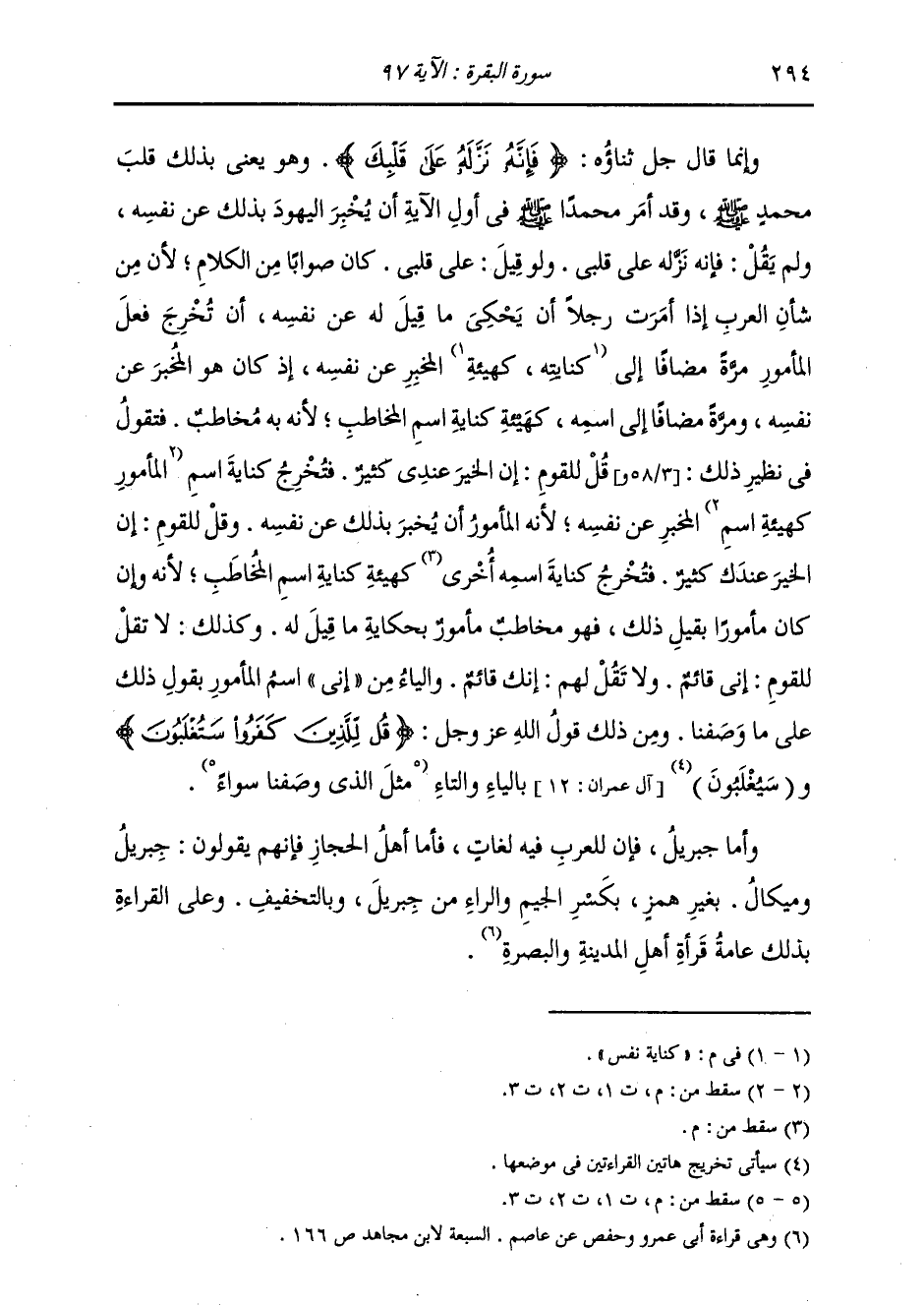 قَالَ أَبُوجَعْفَرٍ: وَإِنَّمَا قَالَ جَلَّ ثَنَاؤُهُ: {فَإِنَّهُ نَزَّلَهُ عَلَى قَلْبِكَ} [البقرة: 97] وَهُوَ يَعْنِي بِذَلِكَ قَلْبَ مُحَمَّدٍ صَلَّى اللهُ عَلَيْهِ وَسَلَّمَ، وَقَدْ أَمَرَ مُحَمَّدًا فِي أَوَّلِ الْآيَةِ أَنْ يُخْبِرَ الْيَهُودَ بِذَلِكَ عَنْ نَفْسِهِ، وَلَمْ يَقُلْ: فَإِنَّهُ نَزَّلَهُ عَلَى قَلْبِي. وَلَوْ قِيلَ: عَلَى قَلْبِي، كَانَ صَوَابًا مِنَ الْقَوْلِ؛ لِأَنَّ مِنْ شَأْنِ الْعَرَبِ إِذَا أَمَرَتْ رَجُلًا أَنْ يَحْكِيَ مَا قِيلَ لَهُ عَنْ نَفْسِهِ أَنْ تُخْرِجَ فِعْلَ الْمَأْمُورِ مَرَّةً مُضَافًا إِلَى كِنَايَةِ نَفْسِ الْمُخْبِرِ عَنْ نَفْسِهِ، إِذْ كَانَ الْمُخْبِرُ عَنْ نَفْسِهِ وَمَرَّةً مُضَافًا إِلَى اسْمِهِ كَهَيْئَةِ كِنَايَةِ اسْمِ الْمُخَاطَبِ لِأَنَّهُ بِهِ مُخَاطَبٌ؛ فَتَقُولُ فِي نَظِيرِ ذَلِكَ: قُلْ لِلْقَوْمِ إِنَّ الْخَيْرَ عِنْدِي كَثِيرٌ، فَتُخْرِجُ كِنَايَةَ اسْمِ الْمُخْبِرِ عَنْ نَفْسِهِ لِأَنَّهُ الْمَأْمُورُ أَنْ يُخْبِرَ بِذَلِكَ عَنْ نَفْسِهِ. وَقُلْ لِلْقَوْمِ: إِنَّ الْخَيْرَ عِنْدَكَ كَثِيرٌ فَتُخْرِجُ كِنَايَةَ اسْمِهِ كَهَيْئَةِ كِنَايَةِ اسْمِ الْمُخَاطَبِ؛ لِأَنَّهُ وَإِنْ كَانَ مَأْمُورًا بِقِيلِ ذَلِكَ فَهُوَ مُخَاطَبٌ مَأْمُورٌ بِحِكَايَةِ مَا قِيلَ لَهُ. وَكَذَلِكَ: " لَا تَقُلْ لِلْقَوْمِ: إِنِّي قَائِمٌ وَلَا تَقُلْ لَهُمْ: إِنَّكَ قَائِمٌ، وَالْيَاءُ مِنْ إِنَّي اسْمُ الْمَأْمُورِ بَقَوْلِ ذَلِكَ عَلَى مَا وَصَفْنَا؛ وَمِنْ ذَلِكَ قَوْلُ اللَّهِ عَزَّ وَجَلَّ: (قُلْ لِلَّذِينَ كَفَرُوا سَيُغْلَبُونَ) وَتُغْلَبُونَ بِالْيَاءِ وَالتَّاءِ. وَأَمَّا جِبْرِيلُ، فَإِنَّ لِلْعَرَبِ فِيهِ لُغَاتٍ. فَأَمَّا أَهْلُ الْحِجَازِ فَإِنَّهُمْ يَقُولُونَ جِبْرِيلُ وَمِيكَالُ بِغَيْرِ هَمْزٍ بِكَسْرِ الْجِيمِ وَالرَّاءِ مِنْ جِبْرِيلَ وَبِالتَّخْفِيفِ؛ وَعَلَى الْقِرَاءَةِ بِذَلِكَ عَامَّةُ قُرَّاءِ أَهْلِ الْمَدِينَةِ وَالْبَصْرَةِ.