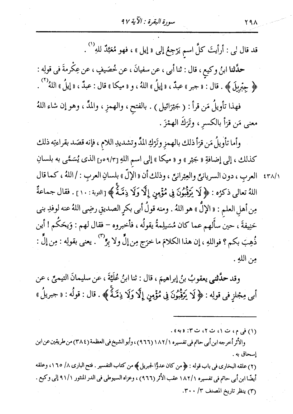 حَدَّثَنَا ابْنُ وَكِيعٍ، قَالَ: ثنا أَبِي، عَنْ سُفْيَانَ، عَنْ خُصَيْفٍ، عَنْ عِكْرِمَةَ: " فِي قَوْلِهِ: {§جِبْرِيلَ} [البقرة: 97] قَالَ: جَبْرُ: عَبْدٌ، إِيلُ: اللَّهُ، وَمِيكَا قَالَ: عَبْدٌ، إِيلُ: اللَّهُ " قَالَ أَبُو جَعْفَرٍ: فَهَذَا تَأْوِيلُ مَنْ قَرَأَ «جَبْرَائِيلَ» بِالْفَتْحِ وَالْهَمْزِ وَالْمَدِّ، وَهُوَ إِنْ شَاءَ اللَّهُ مَعْنَى مَنْ قَرَأَ بِالْكَسْرِ وَتَرْكِ الْهَمْزِ. وَأَمَّا تَأْوِيلُ مَنْ قَرَأَ ذَلِكَ بِالْهَمْزِ وَتَرْكِ الْمَدِّ وَتَشْدِيدِ اللَّامِ، فَإِنَّهُ قَصَدَ بِقَوْلِهِ ذَلِكَ كَذَلِكَ إِلَى إِضَافَةِ جِبْرَ وَمِيكَا إِلَى اسْمِ اللَّهِ الَّذِي يُسَمَّى بِهِ بِلِسَانِ الْعَرَبِ دُونَ السُّرْيَانِيِّ وَالْعِبْرَانِيِّ؛ وَذَلِكَ أَنَّ الْإِلُّ بِلِسَانِ الْعَرَبِ اللَّهُ كَمَا قَالَ: {لَا يَرْقُبُونَ فِي مُؤْمِنٍ إِلًّا وَلَا ذِمَّةً} [التوبة: 10] فَقَالَ جَمَاعَةٌ مِنْ أَهْلِ الْعِلْمِ: الْإِلُّ: هُوَ اللَّهُ. وَمِنْهُ قَوْلُ أَبِي بَكْرٍ الصِّدِّيقِ رَضِيَ اللَّهُ عَنْهُ لِوَفْدِ بَنِي حَنِيفَةَ حِينَ سَأَلَهُمْ عَمَّا كَانَ مُسَيْلِمَةُ يَقُولُ، فَأَخْبَرُوهُ، فَقَالَ لَهُمْ: وَيْحَكُمْ أَيْنَ ذُهِبَ بِكُمْ وَاللَّهِ، إِنَّ هَذَا الْكَلَامَ مَا خَرَجَ مِنْ إِلٍّ وَلَا بِرٍّ. يَعْنِي مِنْ إِلٍّ: مِنَ اللَّهِ
