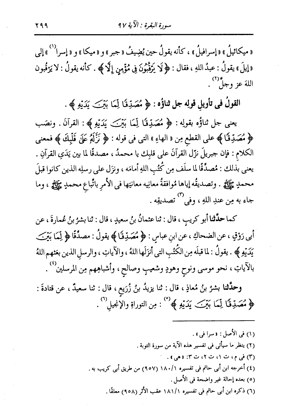 حَدَّثَنَا بِشْرُ بْنُ مُعَاذٍ، قَالَ: ثنا يَزِيدُ بْنُ زُرَيْعٍ، قَالَ: ثنا سَعِيدٌ، عَنْ قَتَادَةَ: " {§مُصَدِّقًا لِمَا بَيْنَ يَدَيْهِ} [البقرة: 97] مِنَ التَّوْرَاةِ وَالْإِنْجِيلِ " -[300]- حُدِّثْتُ عَنْ عَمَّارٍ، قَالَ: ثنا ابْنُ أَبِي جَعْفَرٍ، عَنْ أَبِيهِ، عَنِ الرَّبِيعِ، مِثْلَهُ