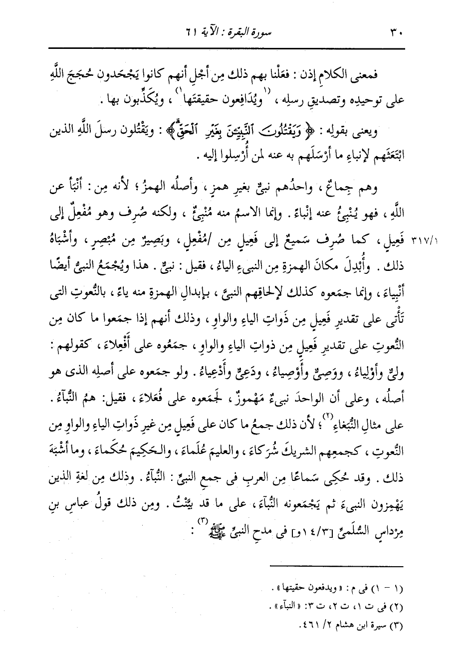 فَمَعْنَى الْكَلَامِ إِذًا: فَعَلْنَا بِهِمْ ذَلِكَ مِنْ أَجْلِ أَنَّهُمْ كَانُوا يَجْحَدُونَ حُجَجَ اللَّهِ عَلَى تَوْحِيدِهِ، وَتَصْدِيقَ رُسُلِهِ وَيَدْفَعُونَ حَقِّيَّتَهَا، وَيُكَذِّبُونَ بِهَا. وَيَعْنِي بِقَوْلِهِ: {وَيَقْتُلُونَ النَّبِيِّينَ بِغَيْرِ الْحَقِّ} [البقرة: 61] وَيَقْتُلُونَ رُسُلَ اللَّهِ الَّذِينَ ابْتَعَثَهُمْ لِإِنْبَاءِ مَا أَرْسَلَهُمْ بِهِ عَنْهُ لِمَنْ أُرْسِلُوا إِلَيْهِ. وَهُمْ جِمَاعٌ وَاحِدُهُمْ نَبِيٌّ، غَيْرُ مَهْمُوزٍ، وَأَصْلُهُ الْهَمْزُ، لِأَنَّهُ مَنْ أَنْبَأَ عَنِ اللَّهِ، فَهُوَ يُنْبِئُ عَنْهُ إِنْبَاءً، وَإِنَّمَا الِاسْمُ مِنْهُ مُنْبِئٌ وَلَكِنَّهُ صُرِفَ وَهُوَ مُفْعِلٍ إِلَى فَعِيلٌ، كَمَا صُرِفَ سَمِيعٌ إِلَى فَعِيلٍ مِنْ مُفْعِلٍ، وَبَصِيرٌ مِنْ مُبْصِرٍ، وَأَشْبَاهُ ذَلِكَ، وَأَبْدَلَ مَكَانَ الْهَمْزَةِ مِنَ النَّبِيءِ الْيَاءَ، فَقِيلَ نَبِيٌّ. هَذَا وَيُجْمَعُ النَّبِيُّ أَيْضًا عَلَى أَنْبِيَاءَ، وَإِنَّمَا جَمَعُوهُ كَذَلِكَ لِإِلْحَاقِهِمُ النَّبِيءَ بِإِبْدَالِ الْهَمْزَةِ مِنْهُ يَاءً بِالنُّعُوتِ الَّتِي تَأْتِي عَلَى تَقْدِيرِ فَعِيلٍ مِنْ ذَوَاتِ الْيَاءِ وَالْوَاوِ. وَذَلِكَ أَنَّهُمْ إِذَا جَمَعُوا مَا كَانَ مِنَ الْمَنْعُوتِ عَلَى تَقْدِيرِ فَعِيلٍ مِنْ ذَوَاتِ الْيَاءِ وَالْوَاوِ جَمَعُوهُ عَلَى أَفْعِلَاءَ، كَقَوْلِهِمْ وَلِيٌّ وَأَوْلِيَاءُ. وَوَصِيٌّ وَأَوْصِيَاءُ. وَدَعِيٌّ وَأَدْعِيَاءُ. وَلَوْ جَمَعُوهُ عَلَى أَصْلِهِ الَّذِي هُوَ أَصْلُهُ. وَعَلَى أَنَّ الْوَاحِدَ نَبِيءٌ مَهْمُوزٌ لَجَمَعُوهُ عَلَى فُعَلَاءَ، فَقِيلَ لَهُمُ النُّبَآءُ، عَلَى مِثَالِ النُّبَغَاءِ، لِأَنَّ ذَلِكَ جُمِعَ مَا كَانَ عَلَى فَعِيلٍ مِنْ غَيْرِ ذَوَاتِ الْيَاءِ وَالْوَاوِ مِنَ الْمَنْعُوتِ كَجَمْعِهِمُ الشَّرِيكَ شُرَكَاءَ، وَالْعَلِيمَ عُلَمَاءَ. وَالْحَكِيمَ حُكَمَاءَ، وَمَا أَشْبَهَ ذَلِكَ. وَقَدْ حُكِيَ سَمَاعًا مِنَ الْعَرَبِ فِي جَمْعِ النَّبِيِّ النُّبَآءُ، وَذَلِكَ مِنْ لُغَةِ الَّذِينَ يَهْمِزُونَ النَّبِيءَ، ثُمَّ يَجْمَعُونَهُ عَلَى النُّبَآءِ عَلَى مَا قَدْ بَيَّنْتُ، وَمِنْ ذَلِكَ قَوْلُ عَبَّاسِ بْنِ مِرْدَاسٍ فِي مَدْحِ النَّبِيِّ صَلَّى اللهُ عَلَيْهِ وَسَلَّمَ.
