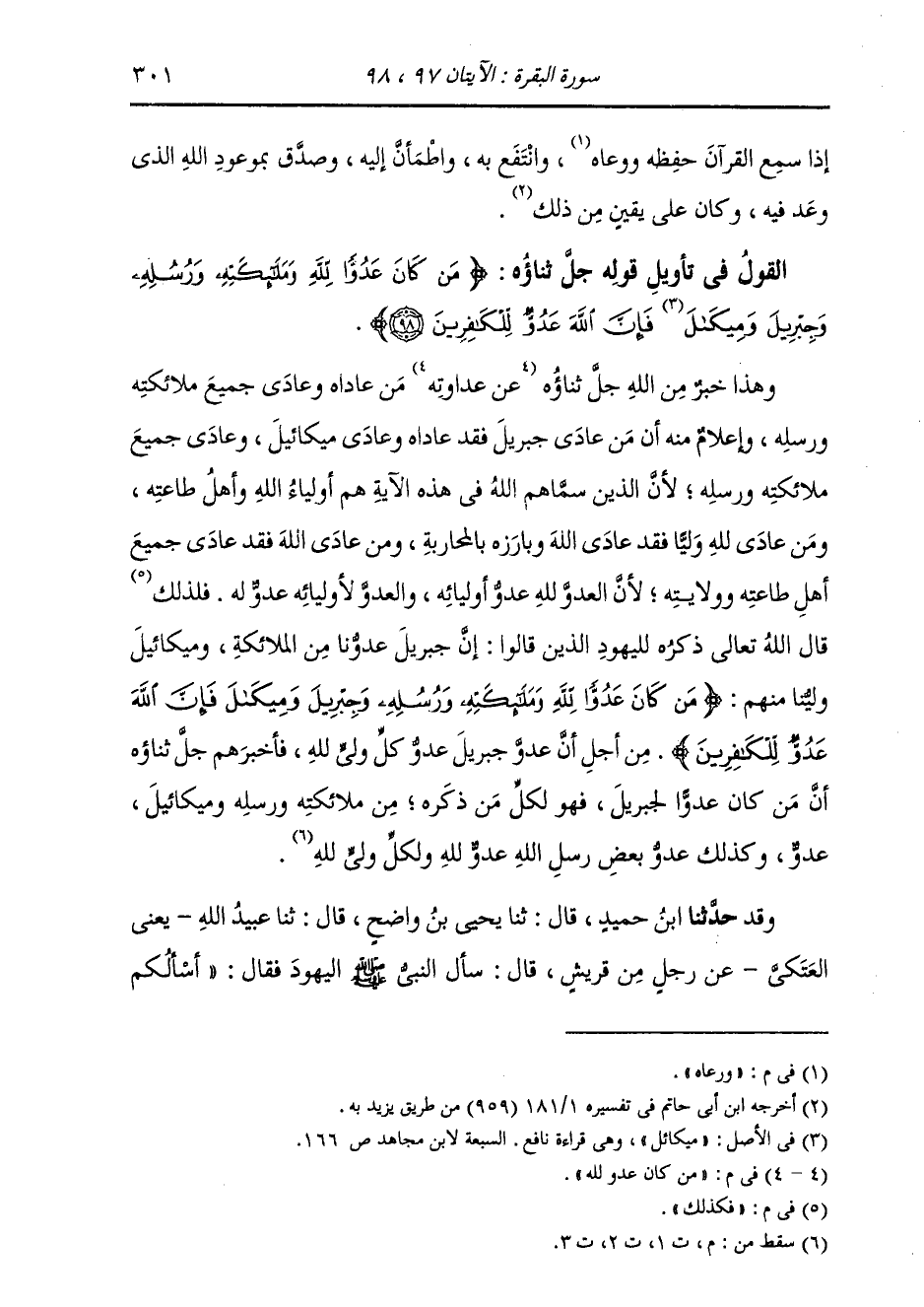 §وَهَذَا خَبَرٌ مِنَ اللَّهِ جَلَّ ثَنَاؤُهُ: {مَنْ كَانَ عَدُوًّا لِلَّهِ} [البقرة: 98] مَنْ عَادَاهُ وَعَادَى جَمِيعَ مَلَائِكَتِهِ وَرُسُلِهِ، وَإِعْلَامٌ مِنْهُ أَنَّ مَنَ عَادَى جِبْرِيلَ فَقَدْ عَادَاهُ وَعَادَى مِيكَائِيلَ وَعَادَى جَمِيعَ مَلَائِكَتِهِ وَرُسُلِهِ؛ لِأَنَّ الَّذِينَ سَمَّاهُمُ اللَّهُ فِي هَذِهِ الْآيَةِ هُمْ أَوْلِيَاءُ اللَّهِ وَأَهْلُ طَاعَتِهِ، وَمَنْ عَادَى لِلَّهِ وَلِيًّا فَقَدْ عَادَى اللَّهَ وَبَارَزَهُ بِالْمُحَارَبَةِ، وَمَنْ عَادَى اللَّهَ فَقَدْ عَادَى جَمِيعَ أَهْلِ طَاعَتِهِ وَوِلَايَتِهِ؛ لِأَنَّ الْعَدُوَّ لِلَّهِ عَدُوٌّ لِأَوْلِيَائِهِ، وَالْعَدُوَّ لِأَوْلِيَاءِ اللَّهِ عَدُوٌّ لَهُ. فَكَذَلِكَ قَالَ لِلْيَهُودِ الَّذِينَ قَالُوا: إِنَّ جِبْرِيلَ عَدُوُّنَا مِنَ الْمَلَائِكَةِ، وَمِيكَائِيلَ وَلِيُّنَا مِنْهُمْ: {مَنْ كَانَ عَدُوًّا لِلَّهِ وَمَلَائِكَتَهِ وَرُسُلِهِ وَجِبْرِيلَ وَمِيكَالَ فَإِنَّ اللَّهَ عَدُوٌّ لِلْكَافِرِينَ} [البقرة: 98] مِنْ أَجْلِ أَنَّ عَدُوَّ جِبْرِيلَ عَدُوُّ كُلِّ وَلِيٍّ لِلَّهِ. فَأَخْبَرَهُمْ جَلَّ ثَنَاؤُهُ أَنَّ مَنْ كَانَ عَدُوًّا لِجِبْرِيلَ فَهُوَ لِكُلِّ مَنْ ذَكَرَهُ مِنْ مَلَائِكَتِهِ وَرُسُلِهِ وَمِيكَالَ عَدُوٌّ، وَكَذَلِكَ عَدُوُّ بَعْضِ رُسُلِ اللَّهِ عَدُوٌّ لِلَّهِ وَلِكُلِّ وَلِيٌّ