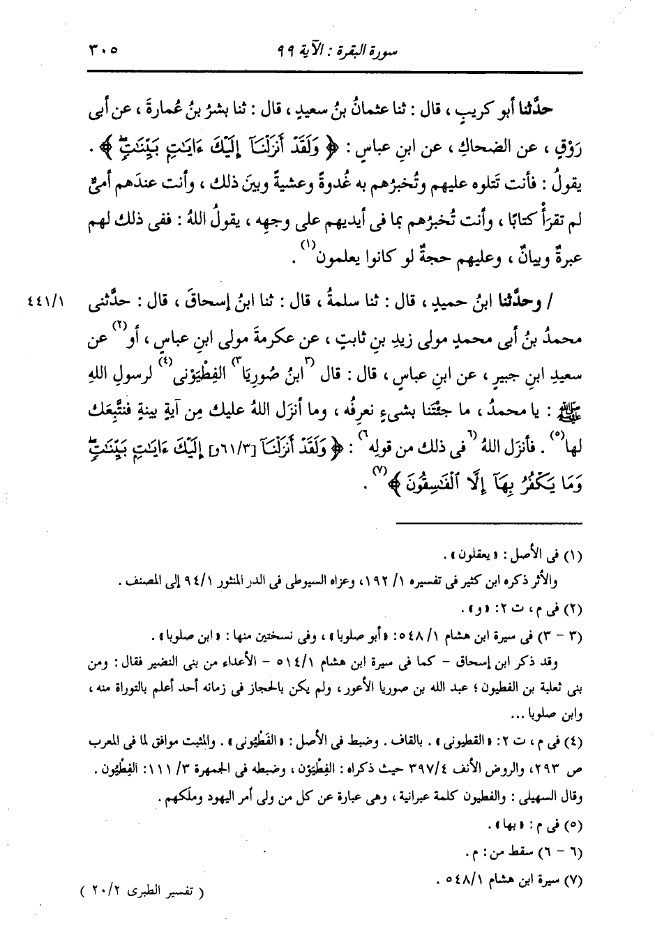 حَدَّثَنَا ابْنُ حُمَيْدٍ، قَالَ: ثنا سَلَمَةُ، قَالَ: ثنا ابْنُ إِسْحَاقَ، قَالَ: حَدَّثَنِي مُحَمَّدُ بْنُ أَبِي مُحَمَّدٍ، مَوْلَى زَيْدِ بْنِ ثَابِتٍ، عَنْ عِكْرِمَةَ، مَوْلَى ابْنِ عَبَّاسٍ، وَعَنْ سَعِيدِ بْنِ جُبَيْرٍ، عَنِ ابْنِ عَبَّاسٍ، قَالَ: قَالَ ابْنُ صُورِيَا الْفَطْيُونِيُّ لِرَسُولِ اللَّهِ صَلَّى اللهُ عَلَيْهِ وَسَلَّمَ: يَا مُحَمَّدُ §مَا جِئْتَنَا بِشَيْءٍ نَعْرِفُهُ، وَمَا أَنْزَلَ اللَّهُ عَلَيْكَ مِنْ آيَةٍ بَيِّنَةٍ فَنَتَّبِعَكَ بِهَا. فَأَنْزَلَ اللَّهُ عَزَّ وَجَلَّ: {وَلَقَدْ أَنْزَلْنَا إِلَيْكَ آيَاتٍ بَيِّنَاتٍ وَمَا يَكْفُرُ بِهَا إِلَّا الْفَاسِقُونَ} [البقرة: 99] " -[306]- حَدَّثَنَا أَبُو كُرَيْبٍ، قَالَ: ثنا يُونُسُ بْنُ بُكَيْرٍ، قَالَ: ثنا مُحَمَّدُ بْنُ إِسْحَاقَ، قَالَ: حَدَّثَنِي مُحَمَّدُ بْنُ أَبِي مُحَمَّدٍ مَوْلَى زَيْدِ بْنِ ثَابِتٍ، قَالَ: حَدَّثَنِي سَعِيدُ بْنُ جُبَيْرٍ أَوْ عِكْرِمَةُ، عَنِ ابْنِ عَبَّاسٍ قَالَ: قَالَ ابْنُ صُورِيَا لِرَسُولِ اللَّهِ صَلَّى اللهُ عَلَيْهِ وَسَلَّمَ، فَذَكَرَ مِثْلَهُ