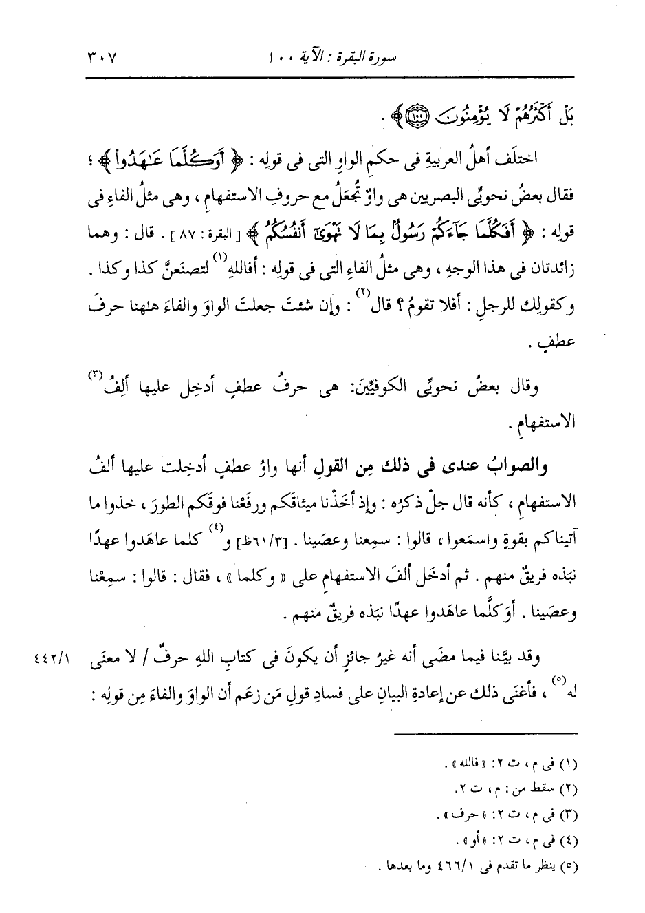§اخْتَلَفَ أَهْلُ الْعَرَبِيَّةِ فِي حُكْمِ الْوَاوِ الَّتِي فِي قَوْلِهِ: {أَوَكُلَّمَا عَاهَدُوا عَهْدًا} [البقرة: 100] فَقَالَ بَعْضُ نَحْوِيِّي الْبَصْرِيِّينَ: هِيَ وَاوٌ تُجْعَلُ مَعَ حُرُوفِ الِاسْتِفْهَامِ، وَهِيَ مِثْلُ الْفَاءِ فِي قَوْلِهِ: {أَفَكُلَّمَا جَاءَكُمْ رَسُولٌ بِمَا لَا تَهْوَى أَنْفُسُكُمُ اسْتَكْبَرْتُمْ} [البقرة: 87] قَالَ: وَهُمَا زَائِدَتَانِ فِي هَذَا الْوَجْهِ، وَهِيَ مِثْلُ الْفَاءِ الَّتِي فِي قَوْلِهِ: فَاللَّهِ لَتَصْنَعَنَّ كَذَا وَكَذَا، وَكَقَوْلِكَ لِلرَّجُلِ: أَفَلَا تَقُومُ؛ وَإِنْ شِئْتَ جَعَلْتَ الْفَاءَ وَالْوَاوَ هَهُنَا حَرْفَ عَطْفٍ. وَقَالَ بَعْضُ نَحْوِيِّي الْكُوفِيِّينَ: هِيَ حَرْفُ عَطْفٍ أُدْخِلَ عَلَيْهَا حَرْفُ الِاسْتِفْهَامِ. وَالصَّوَابُ فِي ذَلِكَ عِنْدِي مِنَ الْقَوْلِ أَنَّهَا وَاوُ عَطْفٍ أُدْخِلَتْ عَلَيْهَا أَلِفُ الِاسْتِفْهَامِ، كَأَنَّهُ قَالَ جَلَّ ثَنَاؤُهُ: {وَإِذْ أَخَذْنَا مِيثَاقَكُمْ وَرَفَعْنَا فَوْقَكُمُ الطُّورَ خُذُوا مَا آتَيْنَاكُمْ بِقُوَّةٍ وَاسْمَعُوا قَالُوا سَمِعْنَا وَعَصَيْنَا} [البقرة: 93] {أَوَكُلَّمَا عَاهَدُوا عَهْدًا نَبَذَهُ فَرِيقٌ مِنْهُمْ} [البقرة: 100] ثُمَّ أَدْخَلَ أَلِفَ الِاسْتِفْهَامِ عَلَى وَكُلَّمَا، فَقَالَ: {قَالُوا سَمِعْنَا وَعَصَيْنَا} [البقرة: 93] {أَوَكُلَّمَا عَاهَدُوا عَهْدًا نَبَذَهُ فَرِيقٌ مِنْهُمْ} [البقرة: 100] وَقَدْ بَيَّنَّا فِيمَا مَضَى أَنَّهُ غَيْرُ جَائِزٍ أَنْ يَكُونَ فِي كِتَابِ اللَّهِ حَرْفٌ لَا مَعْنَى لَهُ، فَأَغْنَى ذَلِكَ عَنْ إِعَادَةِ الْبَيَانِ عَلَى فَسَادِ قَوْلِ مَنْ زَعَمَ أَنَّ الْوَاوَ وَالْفَاءَ مِنْ قَوْلِهِ