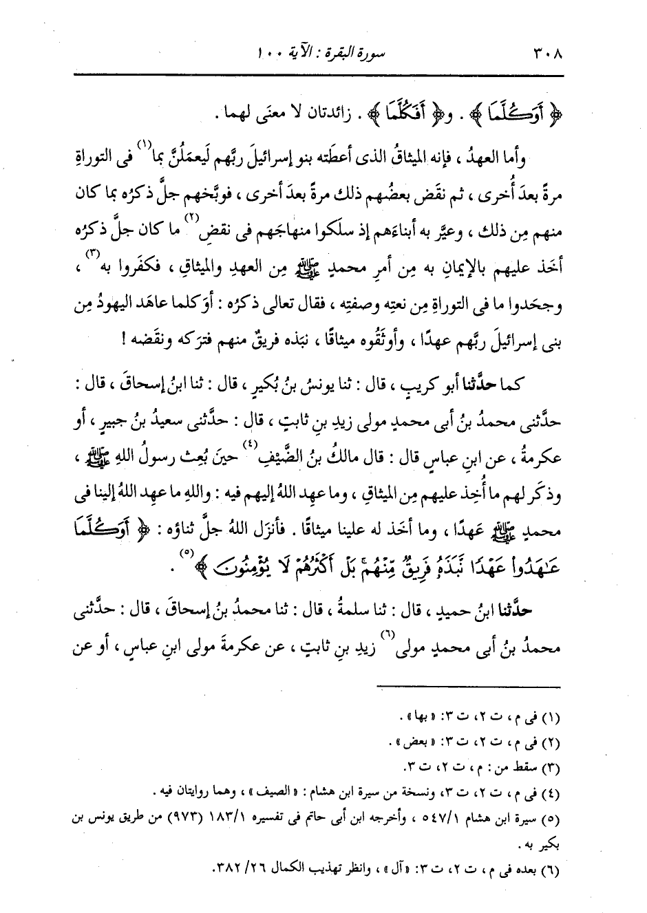 كَمَا حَدَّثَنَا أَبُو كُرَيْبٍ، قَالَ ثنا يُونُسُ بْنُ بُكَيْرٍ، قَالَ: ثنا ابْنُ إِسْحَاقَ، قَالَ: حَدَّثَنِي مُحَمَّدُ بْنُ أَبِي مُحَمَّدٍ، مَوْلَى زَيْدِ بْنِ ثَابِتٍ، قَالَ: حَدَّثَنِي سَعِيدُ بْنُ جُبَيْرٍ أَوْ عِكْرِمَةُ، عَنِ ابْنِ عَبَّاسٍ، قَالَ: " قَالَ مَالِكُ بْنُ الصَّيْفِ حِينَ بُعِثَ رَسُولُ اللَّهِ صَلَّى اللهُ عَلَيْهِ وَسَلَّمَ وَذَكَرَ لَهُمْ مَا أَخَذَ عَلَيْهِمْ مِنَ الْمِيثَاقِ وَمَا عَهِدَ اللَّهِ إِلَيْهِمْ فِيهِ: وَاللَّهِ مَا عَهِدَ إِلَيْنَا فِي مُحَمَّدٍ صَلَّى اللهُ عَلَيْهِ وَسَلَّمَ، وَمَا أَخَذَ لَهُ عَلَيْنَا مِيثَاقًا. فَأَنْزَلَ اللَّهُ جَلَّ ثَنَاؤُهُ: {§أَوَكُلَّمَا عَاهَدُوا عَهْدًا نَبَذَهُ فَرِيقٌ مِنْهُمْ بَلْ أَكْثَرُهُمْ لَا يُؤْمِنُونَ} [البقرة: 100] " حَدَّثَنَا ابْنُ حُمَيْدٍ، قَالَ: ثنا سَلَمَةُ، قَالَ: ثنا مُحَمَّدُ بْنُ إِسْحَاقَ، قَالَ، حَدَّثَنِي مُحَمَّدُ بْنُ أَبِي مُحَمَّدٍ، مَوْلَى آلِ زَيْدِ بْنِ ثَابِتٍ، عَنْ عِكْرِمَةَ مَوْلَى ابْنِ عَبَّاسٍ أَوْ عَنْ -[309]- سَعِيدِ بْنِ جُبَيْرٍ، عَنِ ابْنِ عَبَّاسٍ مِثْلَهُ. قَالَ أَبُو جَعْفَرٍ: وَأَمَّا النَّبْذُ فَإِنَّ أَصْلَهُ فِي كَلَامِ الْعَرَبِ الطَّرْحُ، وَلِذَلِكَ قِيلَ لِلْمَلْقُوطِ: الْمَنْبُوذُ؛ لِأَنَّهُ مَطْرُوحٌ مَرْمِيٌّ بِهِ، وَمِنْهُ سُمِّيَ النَّبِيذُ نَبِيذًا، لِأَنَّهُ زَبِيبٌ أَوْ تَمْرٌ يُطْرَحُ فِي وِعَاءٍ ثُمَّ يُعَالَجُ بِالْمَاءِ. وَأَصْلُهُ مَفْعُولٌ صُرِفَ إِلَى فَعِيلٍ، أَعْنِي أَنَّ النَّبِيذَ أَصْلُهُ مَنْبُوذٌ ثُمَّ صُرِفَ إِلَى فَعِيلٍ، فَقِيلَ نَبِيذٌ كَمَا قِيلَ كَفٌّ خَضِيبٌ وَلِحْيَةٌ دَهِينٌ، يَعْنِي مَخْضُوبَةً وَمَدْهُونَةً؛ يُقَالُ مِنْهُ: نَبَذْتُهُ أَنْبُذُهُ نَبْذًا، كَمَا قَالَ أَبُو الْأَسْوَدِ الدُّؤَلِيُّ: