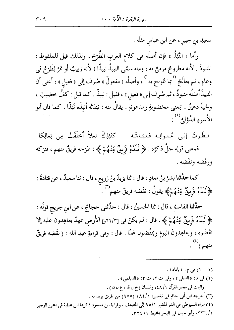 حَدَّثَنَا الْقَاسِمُ، قَالَ: ثنا الْحُسَيْنُ، قَالَ: حَدَّثَنِي حَجَّاجٌ، عَنِ ابْنِ جُرَيْجٍ: " قَوْلُهُ: {نَبَذَهُ فَرِيقٌ مِنْهُمْ} [البقرة: 100] قَالَ: §لَمْ يَكُنْ فِي الْأَرْضِ عَهْدٌ يُعَاهِدُونَ عَلَيْهِ إِلَّا نَقَضُوهُ، وَيُعَاهِدُونَ الْيَوْمَ وَيَنْقُضُونَ غَدًا " قَالَ: وَفِي قِرَاءَةِ عَبْدِ اللَّهِ: «نَقَضَهُ فَرِيقٌ مِنْهُمْ» -[310]- وَالْهَاءُ الَّتِي فِي قَوْلِهِ: {نَبَذَهُ} [البقرة: 100] مِنْ ذِكْرِ الْعَهْدِ، فَمَعْنَاهُ: أَوَكُلَّمَا عَاهَدُوا عَهْدًا نَبَذَ ذَلِكَ الْعَهْدَ فَرِيقٌ مِنْهُمْ. وَالْفَرِيقُ الْجَمَاعَةُ لَا وَاحِدَ لَهُ مِنْ لَفْظِهِ بِمَنْزِلَةِ الْجَيْشِ وَالرَّهْطِ الَّذِي لَا وَاحِدَ لَهُ مِنْ لَفْظِهِ. وَالْهَاءُ وَالْمِيمُ اللَّتَانِ فِي قَوْلِهِ: {فَرِيقٌ مِنْهُمْ} [البقرة: 75] مِنْ ذِكْرِ الْيَهُودِ مِنْ بَنِي إِسْرَائِيلَ