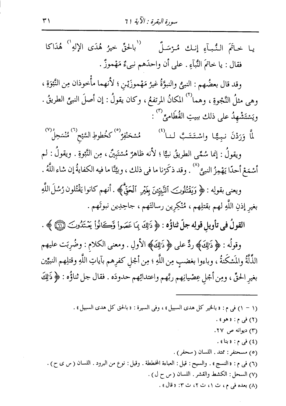 فَقَالَ. يَا خَاتَمَ النُّبَآءِ، عَلَى أَنَّ وَاحِدَهُمُ نَبِيءٌ مَهْمُوزٌ. وَقَدْ قَالَ بَعْضُهُمُ: النَّبِيُّ وَالنُّبُوَّةُ غَيْرُ مَهْمُوزٍ. لِأَنَّهُمَا مَأْخُوذَانِ مِنَ النَّبْوَةِ، وَهِيَ مِثْلُ النَّجْوَةِ، وَهُوَ الْمَكَانُ الْمُرْتَفِعُ. وَكَانَ يَقُولُ إِنَّ أَصْلَ النَّبِيِّ الطَّرِيقُ، وَيَسْتَشْهِدُ عَلَى ذَلِكَ بِبَيْتِ الْقُطَامِيِّ: