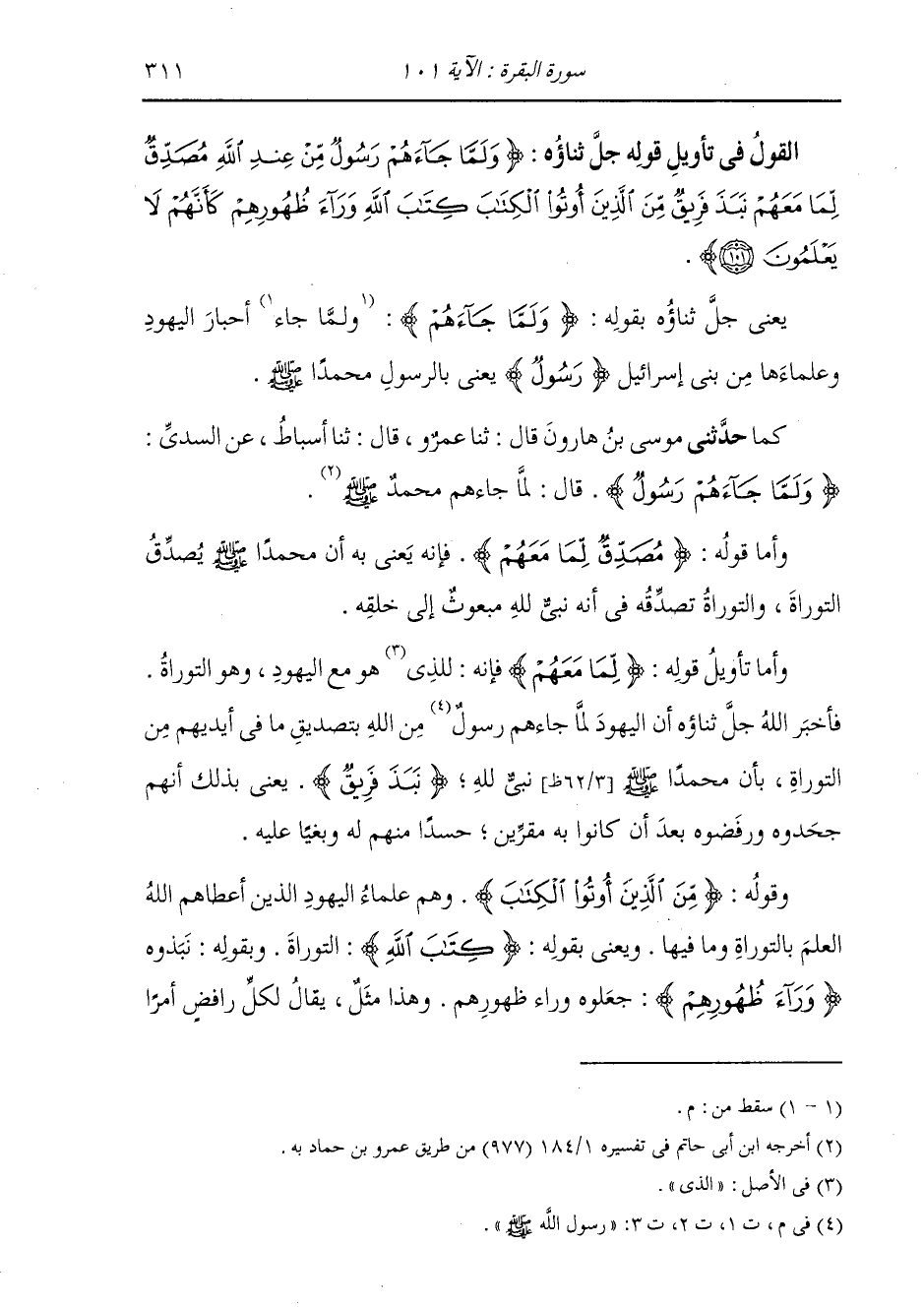 §الْقَوْلُ فِي تَأْوِيلِ قَوْلِهِ تَعَالَى: {وَلَمَّا جَاءَهُمْ رَسُولٌ مِنْ عِنْدِ اللَّهِ مُصَدِّقٌ لِمَا مَعَهُمْ نَبَذَ فَرِيقٌ مِنَ الَّذِينَ أُوتُوا الْكِتَابَ كِتَابَ اللَّهِ وَرَاءَ ظُهُورِهِمْ كَأَنَّهُمْ لَا يَعْلَمُونَ} [البقرة: 101]