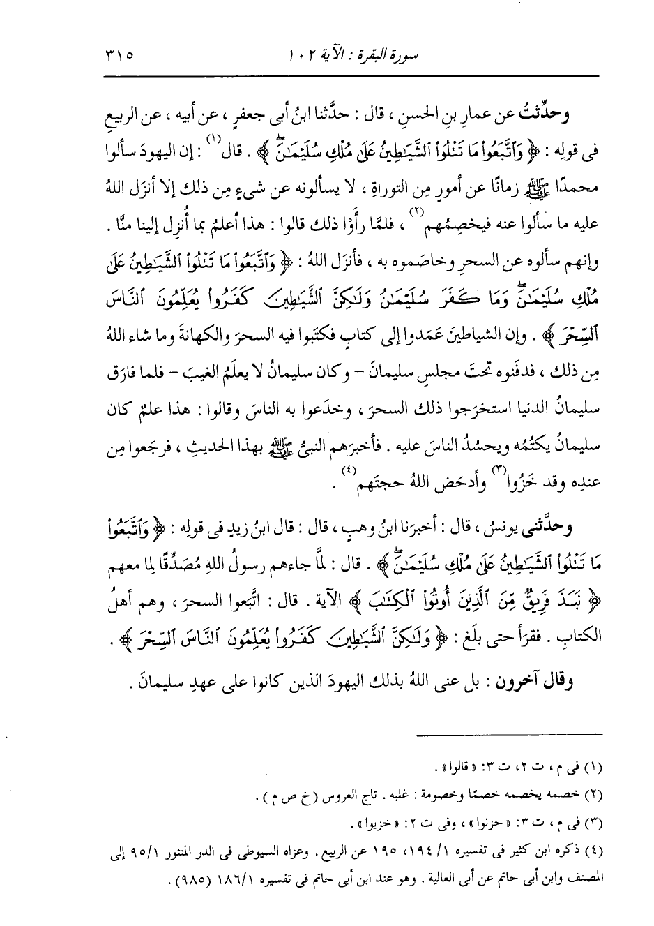 حُدِّثْتُ عَنْ عَمَّارِ بْنِ الْحَسَنِ، قَالَ: ثنا ابْنُ أَبِي جَعْفَرٍ، عَنْ أَبِيهِ، عَنِ الرَّبِيعِ: " فِي قَوْلِهِ: {وَاتَّبَعُوا مَا تَتْلُوا الشَّيَاطِينُ عَلَى مُلْكِ سُلَيْمَانَ} [البقرة: 102] قَالُوا: إِنَّ §الْيَهُودَ سَأَلُوا مُحَمَّدًا صَلَّى اللهُ عَلَيْهِ وَسَلَّمَ زَمَانًا عَنْ أُمُورٍ مِنَ التَّوْرَاةِ، لَا يَسْأَلُونَهُ عَنْ شَيْءٍ مِنْ ذَلِكَ إِلَّا أَنْزَلَ اللَّهُ عَلَيْهِ مَا سَأَلُوهُ عَنْهُ فَيَخْصِمُهُمْ. فَلَمَّا رَأَوْا ذَلِكَ قَالُوا: هَذَا أَعْلَمُ بِمَا أُنْزِلَ إِلَيْنَا مِنَّا. وَإِنَّهُمْ سَأَلُوهُ عَنِ السِّحْرِ وَخَاصَمُوهُ بِهِ، فَأَنْزَلَ اللَّهُ جَلَّ وَعَزَّ: {وَاتَّبَعُوا مَا تَتْلُوا الشَّيَاطِينُ عَلَى مُلْكِ سُلَيْمَانَ وَمَا كَفَرَ سُلَيْمَانَ وَلَكِنَّ الشَّيَاطِينَ كَفَرُوا يُعَلِّمُونَ النَّاسَ السِّحْرَ} [البقرة: 102] . وَإِنَّ الشَّيَاطِينَ عَمَدُوا إِلَى كِتَابٍ فَكَتَبُوا فِيهِ السِّحْرَ وَالْكَهَانَةَ وَمَا شَاءَ اللَّهُ مِنْ ذَلِكَ، فَدَفَنُوهُ تَحْتَ مَجْلِسِ سُلَيْمَانَ، وَكَانَ سُلَيْمَانَ لَا يَعْلَمُ الْغَيْبَ، فَلَمَّا فَارَقَ سُلَيْمَانَ الدُّنْيَا اسْتَخْرَجُوا ذَلِكَ السِّحْرَ، وَخَدَعُوا بِهِ النَّاسَ وَقَالُوا: هَذَا عِلْمٌ كَانَ سُلَيْمَانَ يَكْتُمُهُ وَيَحْسُدُ النَّاسَ عَلَيْهِ. فَأَخْبَرَهُمُ النَّبِيُّ صَلَّى اللهُ عَلَيْهِ وَسَلَّمَ بِهَذَا الْحَدِيثِ. فَرَجَعُوا مِنْ عِنْدِهِ، وَقَدْ حَزِنُوا وَأَدْحَضَ اللَّهُ حُجَّتَهُمْ "