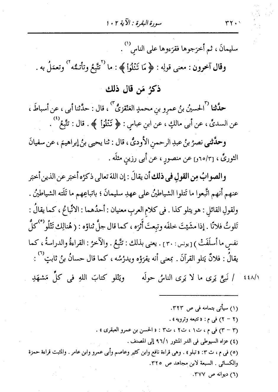 ذِكْرُ مَنْ قَالَ ذَلِكَ حَدَّثَنَا الْحَسَنُ بْنُ عَمْرٍو الْعَنْقَزِيُّ، قَالَ: حَدَّثَنِي أَبِي، عَنْ أَسْبَاطٍ، عَنِ السُّدِّيِّ، عَنْ أَبِي مَالِكٍ، عَنِ ابْنِ عَبَّاسٍ: " {§تَتْلُوا} [البقرة: 102] قَالَ: تَتْبَعُ " حَدَّثَنِي نَصْرُ بْنُ عَبْدِ الرَّحْمَنِ الْأَزْدِيُّ، قَالَ: ثنا يَحْيَى بْنُ إِبْرَاهِيمَ، عَنْ سُفْيَانَ الثَّوْرِيِّ، عَنْ مَنْصُورٍ، عَنْ أَبِي رَزِينٍ، مِثْلَهُقَالَ أَبُوجَعْفَرٍ: وَالصَّوَابُ مِنَ الْقَوْلِ فِي ذَلِكَ أَنْ يُقَالَ: إِنَّ اللَّهَ عَزَّ وَجَلَّ أَخْبَرَ عَنِ الَّذِينَ أَخْبَرَ عَنْهُمْ أَنَّهُمُ اتَّبِعُوا مَا تَتْلُو الشَّيَاطِينُ عَلَى عَهْدِ سُلَيْمَانَ بِاتِّبَاعِهِمْ مَا تَلَتْهُ الشَّيَاطِينُ. وَلِقَوْلِ الْقَائِلِ: هُوَ يَتْلُو كَذَا فِي كَلَامِ الْعَرَبِ مَعْنَيَانِ: أَحَدُهُمَا الِاتِّبَاعُ، كَمَا يُقَالُ: تَلَوْتُ فُلَانًا إِذَا مَشَيْتُ خَلْفَهُ وَتَبِعْتُ أَثَرَهُ، كَمَا قَالَ جَلَّ ثَنَاؤُهُ: {هُنَالِكَ تَبْلُو كُلُّ نَفْسٍ مَا أَسْلَفَتْ} [يونس: 30] يَعْنِي بِذَلِكَ تَتْبَعُ. وَالْآخَرُ: الْقِرَاءَةُ وَالدِّرَاسَةُ، كَمَا تَقُولُ: فُلَانٌ يَتْلُو الْقُرْآنَ، بِمَعْنَى أَنَّهُ يَقْرَؤُهُ وَيَدْرُسُهُ، كَمَا قَالَ حَسَّانُ بْنُ ثَابِتٍ: