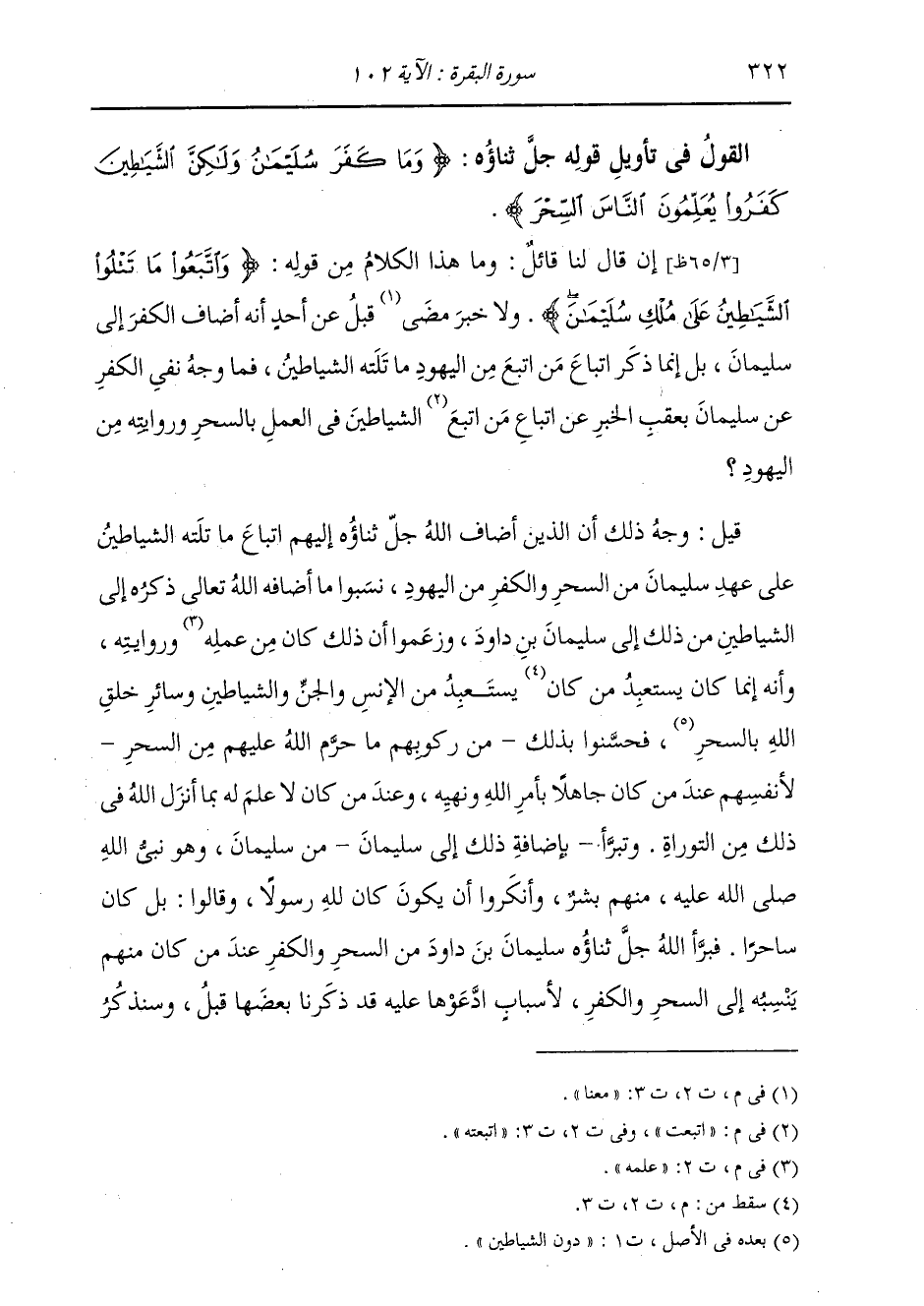 §الْقَوْلُ فِي تَأْوِيلِ قَوْلِهِ تَعَالَى: {وَمَا كَفَرَ سُلَيْمَانُ وَلَكِنَّ الشَّيَاطِينَ كَفَرُوا يُعَلِّمُونَ النَّاسَ السِّحْرَ} [البقرة: 102] إِنْ قَالَ لَنَا قَائِلٌ: وَمَا هَذَا الْكَلَامُ مِنْ قَوْلِهِ: {وَاتَّبَعُوا مَا تَتْلُوا الشَّيَاطِينُ عَلَى مُلْكِ سُلَيْمَانَ} [البقرة: 102] وَلَا خَبَرَ مَعَنَا قَبْلُ عَنْ أَحَدٍ أَنَّهُ أَضَافَ الْكُفْرَ إِلَى سُلَيْمَانَ، بَلْ إِنَّمَا ذَكَرَ اتِّبَاعَ مَنِ اتَّبَعَ مِنَ الْيَهُودِ مَا تَلَتْهُ الشَّيَاطِينُ؟ فَمَا وَجْهُ نَفْيِ الْكُفْرِ عَنْ سُلَيْمَانَ بِعَقِبِ الْخَبَرِ عَنِ اتِّبَاعِ مَنِ اتَّبَعْتِ الشَّيَاطِينُ فِي الْعَمَلِ بِالسِّحْرِ وَرِوَايَتِهِ مِنَ الْيَهُودِ؟ قِيلَ: وَجْهُ ذَلِكَ أَنَّ الَّذِينَ أَضَافَ اللَّهُ جَلَّ ثَنَاؤُهُ إِلَيْهِمُ اتِّبَاعَ مَا تَلَتْهُ الشَّيَاطِينُ عَلَى عَهْدِ سُلَيْمَانَ مِنَ السِّحْرِ وَالْكُفْرِ مِنَ الْيَهُودِ، نَسَبُوا مَا أَضَافَهُ اللَّهُ تَعَالَى ذِكْرُهُ إِلَى الشَّيَاطِينِ مِنْ ذَلِكَ إِلَى سُلَيْمَانَ بْنِ دَاوُدَ، وَزَعَمُوا أَنَّ ذَلِكَ كَانَ مِنْ عِلْمِهِ وَرِوَايَتِهِ، وَأَنَّهُ إِنَّمَا كَانَ يَسْتَعْبِدُ مَنْ يَسْتَعْبِدُ مِنَ الْإِنْسِ وَالْجِنِّ وَالشَّيَاطِينِ وَسَائِرِ خَلْقِ اللَّهِ بِالسِّحْرِ. فَحَسَّنُوا بِذَلِكَ، مِنْ رُكُوبِهِمْ مَا حَرَّمَ اللَّهُ عَلَيْهِمْ مِنَ السِّحْرِ، أَنْفُسَهُمْ عِنْدَ مَنْ كَانَ جَاهِلًا بِأَمْرِ اللَّهِ وَنَهْيِهِ، وَعِنْدَ مَنْ كَانَ لَا عِلْمَ لَهُ بِمَا أَنْزَلَ اللَّهُ فِي ذَلِكَ مِنَ التَّوْرَاةِ، وَتَبَرَّأَ، بِإِضَافَةِ ذَلِكَ إِلَى سُلَيْمَانَ، مِنْ سُلَيْمَانَ، وَهُوَ نَبِيُّ اللَّهِ صَلَّى اللهُ عَلَيْهِ وَسَلَّمَ مِنْهُمْ، بَشَرٌ، وَأَنْكَرُوا أَنْ يَكُونَ كَانَ لِلَّهِ رَسُولًا، وَقَالُوا: بَلْ كَانَ سَاحِرًا. فَبَرَّأَ اللَّهُ سُلَيْمَانَ بْنَ دَاوُدَ مِنَ السِّحْرِ وَالْكُفْرِ عِنْدَ مَنْ كَانَ مِنْهُمْ يَنْسُبُهُ إِلَى السِّحْرِ وَالْكُفْرِ لِأَسْبَابٍ ادَّعُوهَا عَلَيْهِ قَدْ ذَكَرْنَا بَعْضَهَا، وَسَنَذْكُرُ