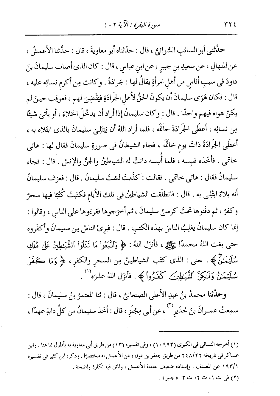 حَدَّثَنِي أَبُو السَّائِبٍ السُّوَائِيُّ، قَالَ: ثَنَا أَبُو مُعَاوِيَةَ، عَنِ الْأَعْمَشِ، عَنِ الْمِنْهَالِ، عَنْ سَعِيدِ بْنِ جُبَيْرٍ، عَنِ ابْنِ عَبَّاسٍ، قَالَ: " §كَانَ الَّذِي أَصَابَ سُلَيْمَانَ بْنَ دَاوُدَ فِي سَبَبِ أُنَاسٍ مِنْ أَهْلِ امْرَأَةٍ يُقَالُ لَهَا: جَرَادَةُ، وَكَانَتْ مِنْ أَكْرَمِ نِسَائِهِ عَلَيْهِ، قَالَ: فَكَانَ هَوَى سُلَيْمَانَ أَنْ يَكُونَ الْحَقُّ لِأَهْلِ الْجَرَادَةِ فَيَقْضِيَ لَهُمْ، فَعُوقِبَ حِينَ لَمْ يَكُنْ هَوَاهُ فِيهِمْ وَاحِدًا. قَالَ: وَكَانَ سُلَيْمَانُ بْنُ دَاوُدَ إِذَا أَرَادَ أَنْ يَدْخُلَ الْخَلَاءَ أَوْ يَأْتِيَ شَيْئًا مِنْ نِسَائِهِ أَعْطَى الْجَرَادَةَ خَاتَمَهُ. فَلَمَّا أَرَادَ اللَّهُ أَنْ يَبْتَلِيَ سُلَيْمَانَ بِالَّذِي ابْتَلَاهُ بِهِ، أَعْطَى الْجَرَادَةَ ذَاتَ يَوْمٍ خَاتَمَهُ، فَجَاءَ الشَّيْطَانُ فِي صُورَةِ سُلَيْمَانَ فَقَالَ لَهَا: هَاتِي خَاتَمِي. فَأَخَذَهُ فَلَبِسَهُ، فَلَمَّا لَبِسَهُ دَانَتْ لَهُ الشَّيَاطِينُ وَالْجِنُّ وَالْإِنْسُ. قَالَ: فَجَاءَهَا سُلَيْمَانَ فَقَالَ: هَاتِي خَاتَمِي. فَقَالَتْ: كَذَبْتَ، لَسْتَ بِسُلَيْمَانَ. قَالَ: فَعَرَفَ سُلَيْمَانَ أَنَّهُ بَلَاءٌ ابْتُلِيَ بِهِ. قَالَ: فَانْطَلَقَتِ الشَّيَاطِينُ فَكَتَبَتْ فِي تِلْكَ الْأَيَّامِ كُتُبًا فِيهَا سِحْرٌ وَكُفْرٌ ثُمَّ دَفَنُوهَا تَحْتَ كُرْسِيِّ سُلَيْمَانَ، ثُمَّ أَخْرَجُوهَا فَقَرَءُوهَا عَلَى النَّاسِ، وَقَالُوا: إِنَّمَا كَانَ سُلَيْمَانَ يَغْلِبُ النَّاسَ بِهَذِهِ الْكُتُبِ. قَالَ: فَبَرِئَ النَّاسُ مِنْ سُلَيْمَانَ وَأَكْفَرُوهُ، حَتَّى بَعَثَ اللَّهُ مُحَمَّدًا صَلَّى اللهُ عَلَيْهِ وَسَلَّمَ؛ فَأَنْزَلَ جَلَّ ثَنَاؤُهُ: {وَاتَّبَعُوا مَا تَتْلُوا الشَّيَاطِينُ عَلَى مُلْكِ سُلَيْمَانَ} [البقرة: 102] ، يَعْنِي الَّذِي كَتَبَ الشَّيَاطِينُ مِنَ السِّحْرِ وَالْكُفْرِ، {وَمَا كَفَرَ سُلَيْمَانَ وَلَكِنَّ الشَّيَاطِينَ كَفَرُوا} [البقرة: 102] ، فَأَنْزَلَ اللَّهُ جَلَّ وَعَزَّ وَعَذَرَهُ "