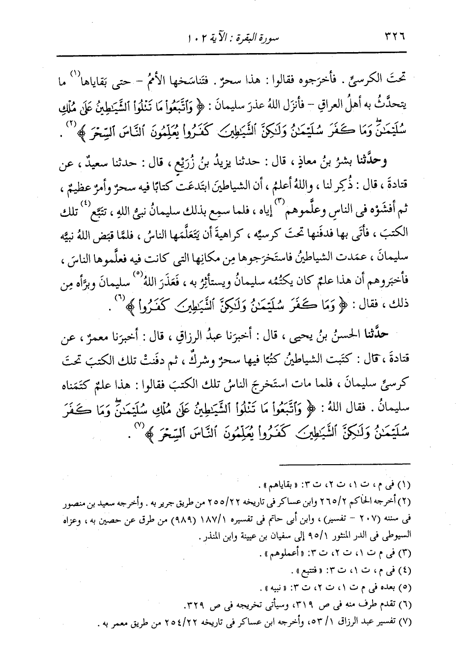 حَدَّثَنَا بِشْرُ بْنُ مُعَاذٍ، قَالَ: ثَنَا يَزِيدُ، قَالَ: ثَنَا سَعِيدٌ، عَنْ قَتَادَةَ، قَالَ: " ذُكِرَ لَنَا، وَاللَّهُ أَعْلَمُ: أَنَّ §الشَّيَاطِينَ ابْتَدَعَتْ كِتَابًا فِيهِ سِحْرٌ وَأَمْرٌ عَظِيمٌ، ثُمَّ أَفْشَوْهُ فِي النَّاسِ وَأَعْلَمُوهُمْ إِيَّاهُ. فَلَمَّا سَمِعَ بِذَلِكَ سُلَيْمَانَ نَبِيُّ اللَّهِ صَلَّى اللهُ عَلَيْهِ وَسَلَّمَ تَتَبَّعَ تِلْكَ الْكُتُبَ، فَأَتَى بِهَا فَدَفَنَهَا تَحْتَ كُرْسِيِّهِ كَرَاهِيَةَ أَنْ يَتَعَلَّمَهَا النَّاسُ. فَلَمَّا قَبَضَ اللَّهُ نَبِيَّهُ سُلَيْمَانَ عَمِدَتِ الشَّيَاطِينُ فَاسْتَخْرَجُوهَا مِنْ مَكَانِهَا الَّذِي كَانَتْ فِيهِ فَعَلَّمُوهَا النَّاسَ، فَأَخْبَرُوهُمْ أَنَّ هَذَا عِلْمٌ كَانَ يَكْتُمُهُ سُلَيْمَانَ وَيَسْتَأْثِرُ بِهِ، فَعَذَرَ اللَّهُ نَبِيَّهُ سُلَيْمَانَ وَبَرَّأَهُ مِنْ ذَلِكَ، فَقَالَ جَلَّ ثَنَاؤُهُ: {وَمَا كَفَرَ سُلَيْمَانَ وَلَكِنَّ الشَّيَاطِينَ كَفَرُوا} [البقرة: 102] "