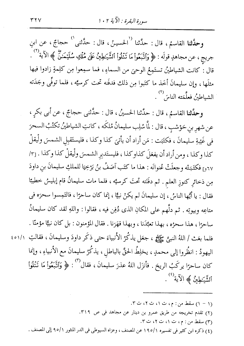 حَدَّثَنَا الْقَاسِمُ، قَالَ: ثَنَا الْحُسَيْنُ، قَالَ: حَدَّثَنِي حَجَّاجٌ، عَنْ أَبِي بَكْرٍ، عَنْ شَهْرِ بْنِ حَوْشَبٍ، قَالَ: " §لَمَّا سَلَبَ سُلَيْمَانَ مُلْكَهُ كَانَتِ الشَّيَاطِينُ تَكْتُبُ السِّحْرَ فِي غَيْبَةِ سُلَيْمَانَ، فَكَتَبَتْ: مَنْ أَرَادَ أَنْ يَأْتِيَ كَذَا وَكَذَا فَلْيَسْتَقْبِلِ الشَّمْسَ وَلْيَقُلْ كَذَا وَكَذَا، وَمَنْ أَرَادَ أَنْ يَفْعَلَ كَذَا وَكَذَا فَلْيَسْتَدْبِرِ الشَّمْسَ وَلْيَقُلْ كَذَا وَكَذَا. فَكَتَبَتْهُ وَجَعَلَتْ عُنْوَانَهُ: «هَذَا مَا كَتَبَ آصِفُ بْنُ بَرْخِيَا لِلْمَلِكِ سُلَيْمَانَ بْنِ دَاوُدَ مِنْ ذِخَائِرِ كُنُوزِ الْعِلْمِ» ثُمَّ دَفَنَتْهُ تَحْتَ كُرْسِيِّهِ. فَلَمَّا مَاتَ سُلَيْمَانَ قَامَ إِبْلِيسُ خَطِيبًا، فَقَالَ: يَا أَيُّهَا النَّاسُ إِنَّ سُلَيْمَانَ لَمْ يَكُنْ نَبِيًّا، وَإِنَّمَا كَانَ سَاحِرًا، فَالْتَمِسُوا سِحْرَهُ فِي مَتَاعِهِ وَبُيُوتِهِ. ثُمَّ دَلَّهُمْ عَلَى الْمَكَانِ الَّذِي دُفِنَ فِيهِ، فَقَالُوا: وَاللَّهِ لَقَدْ كَانَ سُلَيْمَانَ سَاحِرًا، هَذَا سِحْرُهُ، بِهَذَا تعَبَّدَنَا، وَبِهَذَا قَهَرَنَا. فَقَالَ الْمُؤْمِنُونَ: بَلْ كَانَ نَبِيًّا مُؤْمِنًا، فَلَمَّا بَعَثَ اللَّهُ النَّبِيَّ مُحَمَّدًا صَلَّى اللهُ عَلَيْهِ وَسَلَّمَ جَعَلَ يَذْكُرُ الْأَنْبِيَاءَ حَتَّى ذَكَرَ دَاوُدَ وَسُلَيْمَانَ، فَقَالَتِ الْيَهُودُ: انْظُرُوا إِلَى مُحَمَّدٍ يَخْلِطُ الْحَقَّ بِالْبَاطِلِ، يَذْكُرُ سُلَيْمَانَ مَعَ الْأَنْبِيَاءِ، وَإِنَّمَا كَانَ سَاحِرًا يَرْكَبُ الرِّيحَ. فَأَنْزَلَ اللَّهُ عُذْرَ سُلَيْمَانَ: {وَاتَّبَعُوا مَا تَتْلُوا الشَّيَاطِينُ عَلَى مُلْكِ سُلَيْمَانَ} [البقرة: 102] الْآيَةَ "