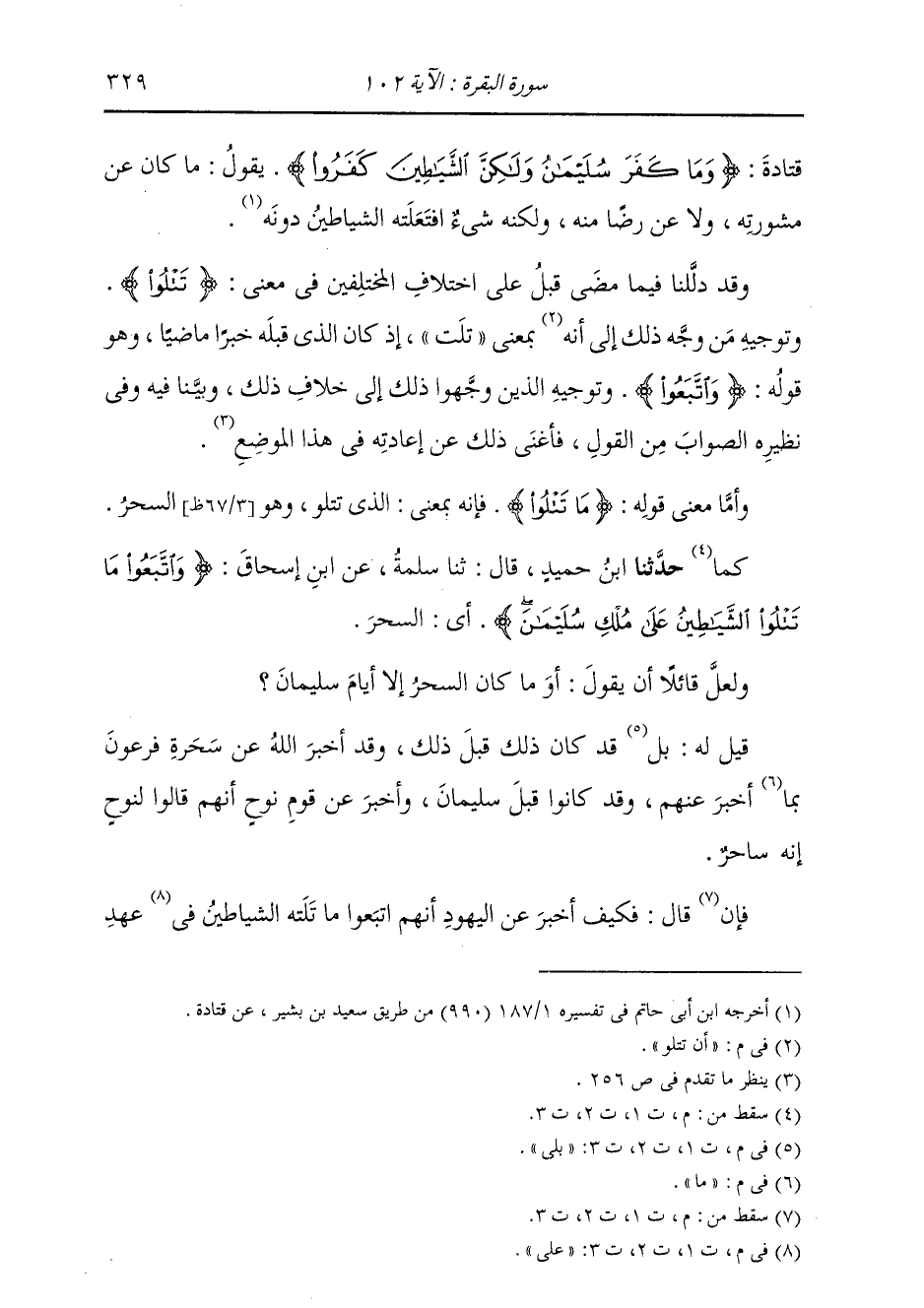 حَدَّثَنَا ابْنُ حُمَيْدٍ، قَالَ: ثَنَا سَلَمَةُ، عَنِ ابْنِ إِسْحَاقَ: " {§وَاتَّبَعُوا مَا تَتْلُوا الشَّيَاطِينُ عَلَى مُلْكِ سُلَيْمَانَ} [البقرة: 102] أَيْ السِّحْرَ " قَالَ أَبُو جَعْفَرٍ: وَلَعَلَّ قَائِلًا أَنْ يَقُولَ: أَوَمَا كَانَ السِّحْرُ إِلَّا أَيَّامَ سُلَيْمَانَ؟ قِيلَ لَهُ: بَلَى قَدْ كَانَ ذَلِكَ قَبْلَ ذَلِكَ، وَقَدْ أَخْبَرَ اللَّهُ عَنْ سَحَرَةِ فِرْعَوْنَ مَا أَخْبَرَ عَنْهُمْ، وَقَدْ كَانُوا قَبْلَ سُلَيْمَانَ، وَأَخْبَرَ عَنْ قَوْمِ نُوحٍ أَنَّهُمْ قَالُوا لِنُوحٍ إِنَّهُ سَاحِرٌ؛ قَالَ: فَكَيْفَ أَخْبَرَ عَنِ الْيَهُودِ أَنَّهُمُ اتَّبِعُوا مَا تَلَتْهُ الشَّيَاطِينُ عَلَى عَهْدِ -[330]- سُلَيْمَانَ؟ قِيلَ: لِأَنَّهُمْ أَضَافُوا ذَلِكَ إِلَى سُلَيْمَانَ عَلَى مَا قَدْ قَدَّمْنَا الْبَيَانَ عَنْهُ، فَأَرَادَ اللَّهُ تَعَالَى ذِكْرُهُ تَبْرِئَةَ سُلَيْمَانَ مِمَّا نَحَلُوهُ وَأَضَافُوا إِلَيْهِ مِمَّا كَانُوا وَجَدُوهُ، إِمَّا فِي خَزَائِنِهِ وَإِمَّا تَحْتَ كُرْسِيِّهِ، عَلَى مَا جَاءَتْ بِهِ الْآثَارُ الَّتِي قَدْ ذَكَرْنَاهَا مِنْ ذَلِكَ. فَحُصِرَ الْخَبَرُ عَمَّا كَانَتِ الْيَهُودُ اتَّبَعَتْهُ فِيمَا تَلَتْهُ الشَّيَاطِينُ أَيَّامَ سُلَيْمَانَ دُونَ غَيْرِهِ لِذَلِكَ السَّبَبِ. وَإِنْ كَانَ الشَّيَاطِينُ قَدْ كَانَتْ تَالِيَةً لِلسِّحْرِ وَالْكُفْرِ قَبْلَ ذَلِكَ