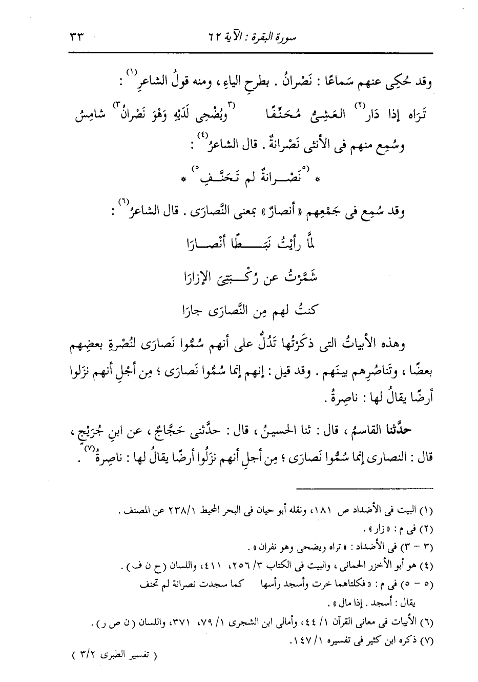 وَهَذِهِ الْأَبْيَاتُ الَّتِي ذَكَرْتُهَا تَدُلُّ عَلَى أَنَّهُمْ سُمُّوا نَصَارَى لِنُصْرَةِ بَعْضِهِمْ بَعْضًا وَتَنَاصُرِهِمْ بَيْنَهُمْ. وَقَدْ قِيلَ إِنَّهُمْ سُمُّوا نَصَارَى مِنْ أَجْلِ أَنَّهُمْ نَزَلُوا أَرْضًا يُقَالُ لَهَا نَاصِرَةٌ