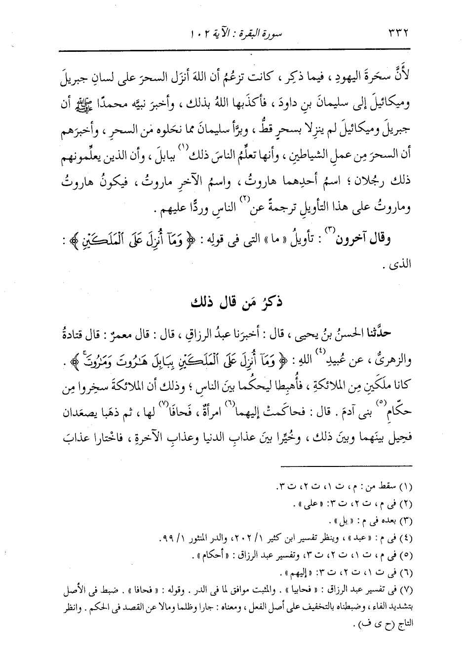 ذِكْرُ مَنْ قَالَ ذَلِكَ حَدَّثَنَا الْحَسَنُ بْنُ يَحْيَى، قَالَ: أَخْبَرَنَا عَبْدُ الرَّزَّاقِ، قَالَ: قَالَ مَعْمَرٌ، قَالَ قَتَادَةُ وَالزُّهْرِيُّ، عَنْ عَبْدِ اللَّهِ: " {§وَمَا أُنْزِلَ عَلَى الْمَلَكَيْنِ بِبَابِلَ هَارُوتَ وَمَارُوتَ} [البقرة: 102] كَانَا مَلَكَيْنِ مِنَ الْمَلَائِكَةِ فَأُهْبِطَا لِيَحْكُمَا بَيْنَ النَّاسِ. وَذَلِكَ أَنَّ الْمَلَائِكَةَ سَخِرُوا مِنْ أَحْكَامِ بَنِي آدَمَ، قَالَ: فَحَاكَمَتْ إِلَيْهِمَا امْرَأَةٌ فَحَافَا لَهَا، ثُمَّ ذَهَبَا يَصْعَدَانِ، فَحِيلَ بَيْنَهُمَا وَبَيْنَ ذَلِكَ وَخُيِّرَا بَيْنَ عَذَابِ الدُّنْيَا وَعَذَابِ الْآخِرَةِ، فَاخْتَارَا عَذَابَ -[333]- الدُّنْيَا " قَالَ مَعْمَرٌ: قَالَ قَتَادَةُ: فَكَانَا يُعَلِّمَانِ النَّاسَ السِّحْرَ، فَأُخِذَ عَلَيْهِمَا أَنْ لَا يُعَلِّمَا أَحَدًا حَتَّى يَقُولَا: إِنَّمَا نَحْنُ فِتْنَةٌ فَلَا تَكْفُرْ