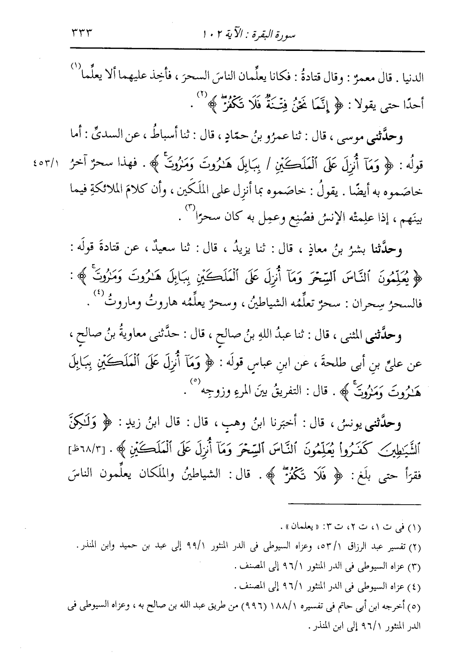 حَدَّثَنَا بِشْرُ بْنُ مُعَاذٍ، قَالَ: ثَنَا يَزِيدُ، قَالَ: ثَنَا سَعِيدٌ، عَنْ قَتَادَةَ: " قَوْلُهُ: {§يُعَلِّمُونَ النَّاسَ السِّحْرَ وَمَا أُنْزِلَ عَلَى الْمَلَكَيْنِ بِبَابِلَ هَارُوتَ وَمَارُوتَ} [البقرة: 102] فَالسِّحْرُ سِحْرَانِ: سِحْرٌ تَعْلَمُهُ الشَّيَاطِينُ، وَسِحْرٌ يَعْلَمُهُ هَارُوتَ وَمَارَوتُ "